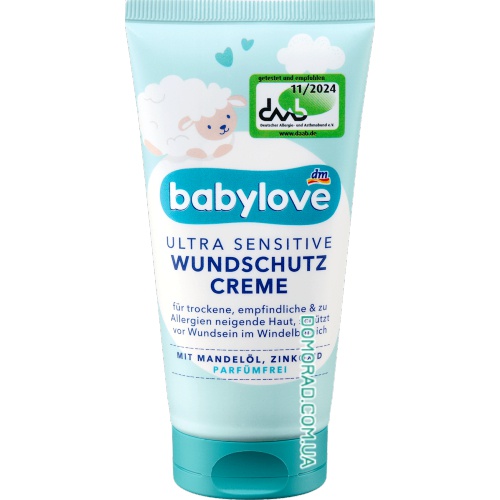 Крем для захисту від ран і випрілостей Babylove Ultra Sensitive дбає про чутливу дитячу шкіру та захищає від болю в області підгузників. Поживна формула надає заспокійливу дію на шкіру та допомагає зняти почервоніння. Формула без запаху з мигдалевою олією та оксидом цинку утворює ефективну плівку та захищає ніжну дитячу шкіру в області підгузників від вологи. Також ідеально підходить для дорослих із сухою, чутливою та схильною до алергії шкірою. Протестовано та рекомендовано Німецькою асоціацією алергологів та астми