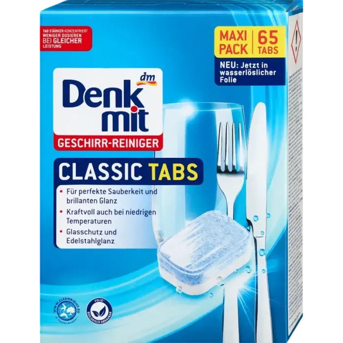 Революційна формула Denkmit "Classic" у таблетках ефективно очищає брудний посуд, надає їй чистого сяючого вигляду, при цьому зберігаючи художні візерунки на посуді, протидіє плямам від води та утворенню вапняного накипу. Перешкоджає природному помутнінню скляного посуду. Denkmit Tabs ефективно очищає кухонні прибори зі срібла та нержавіючої сталі. Також Denkmit "Classic" запобігає відкладенню жиру, вапна та бруду в посудомийній машині.