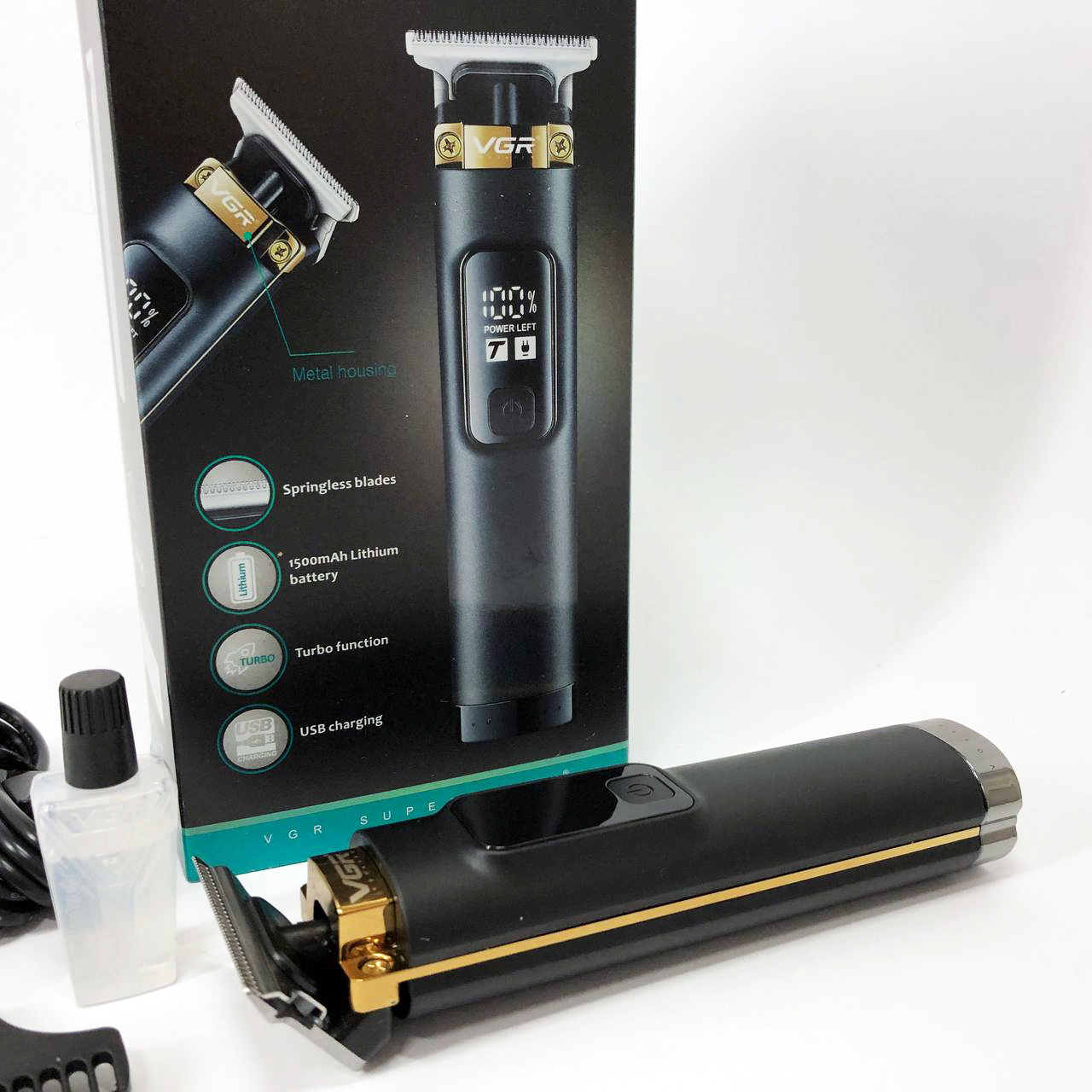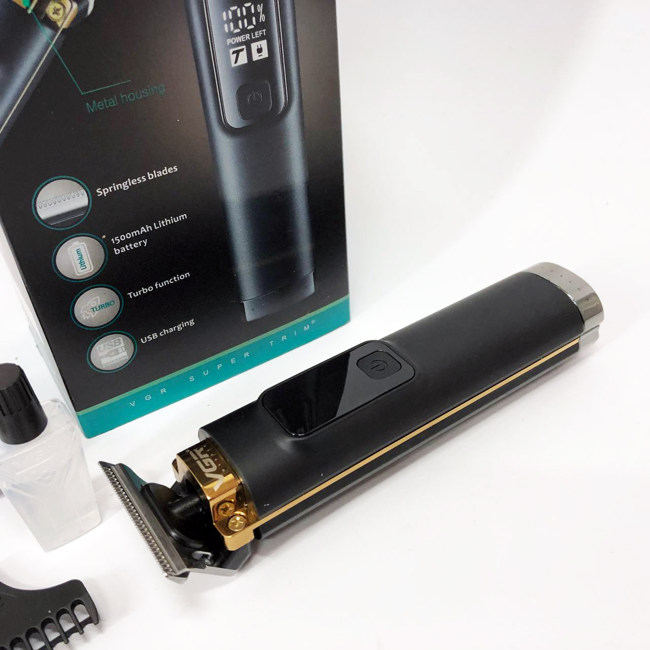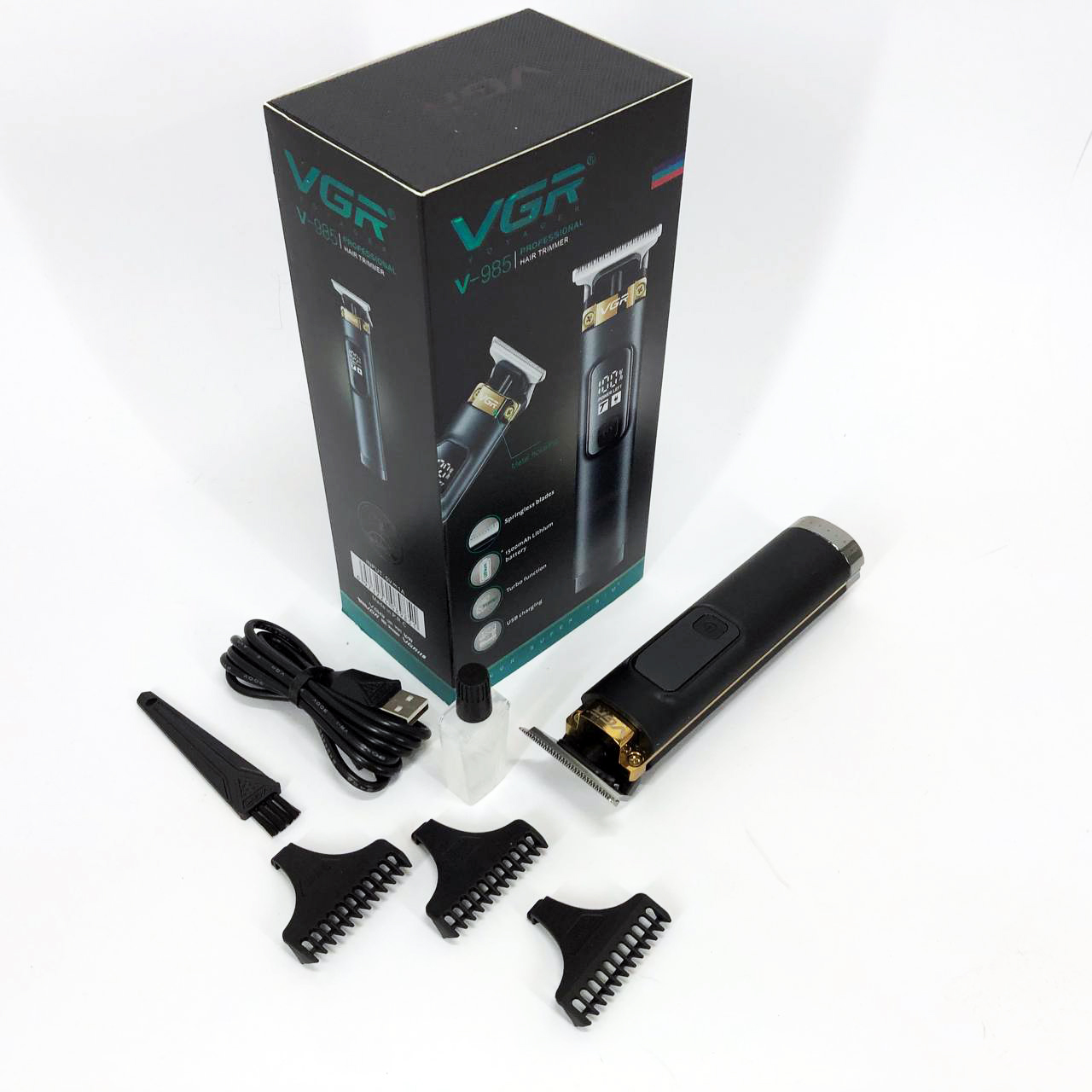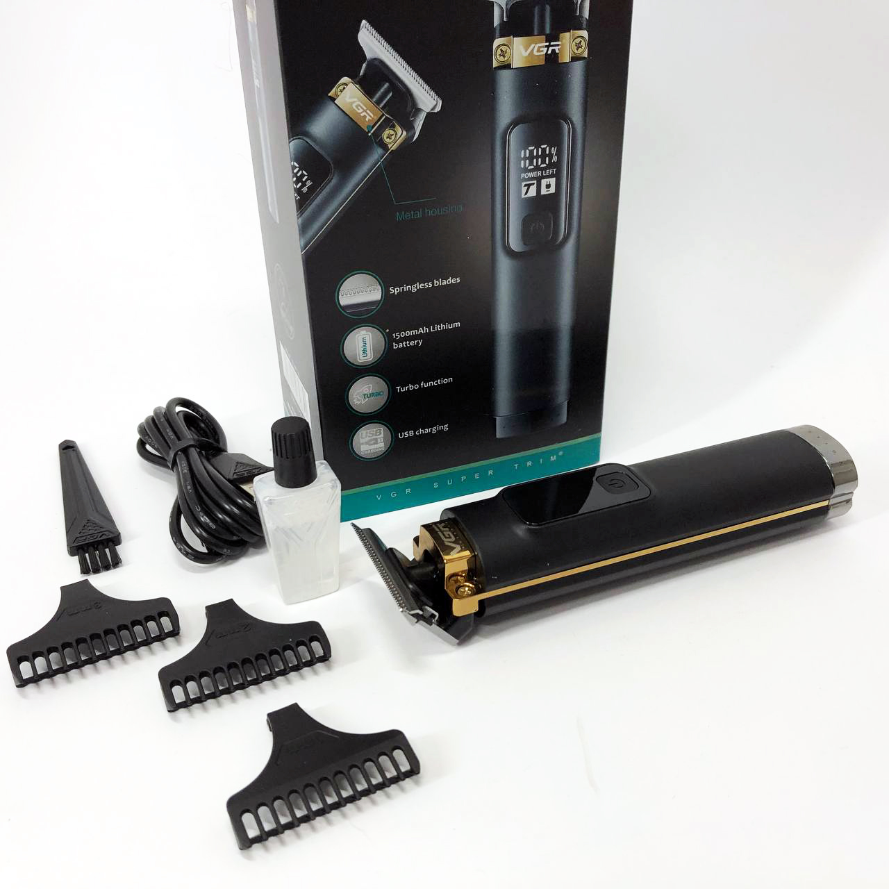 VGR V-985 — це першокласний триммер для чоловіків з міцним корпусом та гострим лезом з нержавіючої сталі. Завдяки літієвій батареї ємністю 1500 мАч і блоку живлення 5 В ви можете насолоджуватися 200 хвилинами безперервної роботи після 2,5-годинної зарядки . Цей триммер підходить як для мережного, так і для бездротового використання і оснащений кнопкою УВІМК/ВИМК з турборежумом, а також світлодіодним дисплеєм для індикації заряду акумулятора. За допомогою насадок (1/2/3 мм) і захистіть лезо за допомогою захисного ковпачка, що додається. Кабель USB Type-C, олія та щіточка для очищення доповнюють комплект.