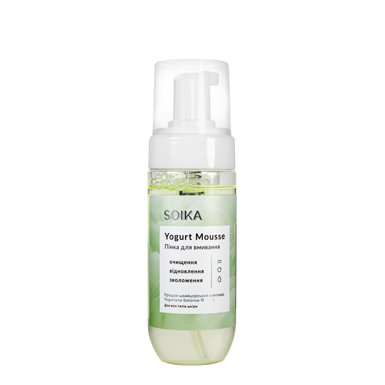 Пінка для вмивання Soika Yogurt Mousse з пробіотичним комплексом, екстрактами зеленого чаю та алоеПінка для очищення обличчя Soika має зволожувальну, відновлювальну, антиоксидантну, протизапальну та захисну дію. Засіб для вмивання не містить сульфатів і створена на основі м'якої ПАР із фруктової кислоти. Це зменшує втрату вологи, підтримує здорову мікрофлору епідермісу, відновлює та зміцнює захисний бар'єр. Після вмивання ви відчуваєте, як шкіра стає шовковистою та підтягнутою, з'являється почуття комфорту, чистоти та свіжості. Засіб відмінно підходить для всіх типів шкіри та може застосовуватися навіть із 12-річного віку.Очисна пінка для обличчя містить:швейцарський комплекс Yogurtene Balance — містить йогурт, пребіотики інулін, білки молочної кислоти, лактозу, вітаміни А, В, що забезпечують зволоження та живлення шкірного покриву;