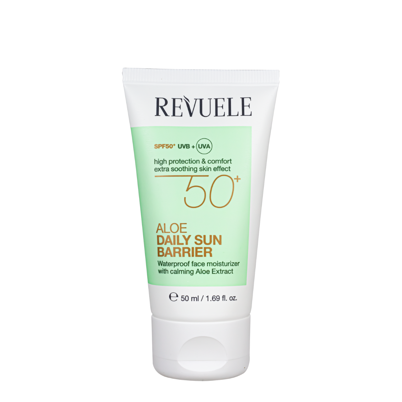 Сонцезахисний крем для обличчя Revuele Aloe Daily Sun Barrier із SPF50 зволожуючий широкого спектру захистуRevuele Aloe Daily Sun Barrier SPF 50+ – легкий крем-флюїд, який миттєво охолоджує та зволожує шкіру, а також захищає епідерміс від пошкодження променями UVA/UVB. Його формула стійка до вологи й поту, тому ефективніша в спекотний літній час, а також під час опадів в порівнянні з багатьма іншими аналогами. Ідеально підходить для всіх типів шкіри, навіть чутливої.До складу сонцезахисного крему для обличчя СПФ 50 включений екстракт алое віра, відомий своїми заспокійливими, зволожуючими, антисептичними, відновлювальними властивостями. Алое інтенсивно заспокоює та насичує молекулами води шкіру, усуваючи дискомфорт та подразнення.Засіб із СПФ ефективний протягом усього року. Він досить легкий у спекотні чи вологі літні дні. Взимку крем з алое віра відмінно насичує вологою, повертає свіжість та сяйво шкірі, що страждає від впливу опалення, вітру, морозу. Продукт має надзвичайно ніжну текстуру, швидко вбирається, не залишаючи слідів.Спосіб використання: Нанесіть на очищену шкіру вранці на останньому етапі догляду за обличчям і шиєю. Рекомендується повторно наносити засіб на шкіру протягом дня, особливо після протирання шкіри. Не вимагає обов'язкового нанесення інших зволожуючих кремів.Об'єм: 50 мл