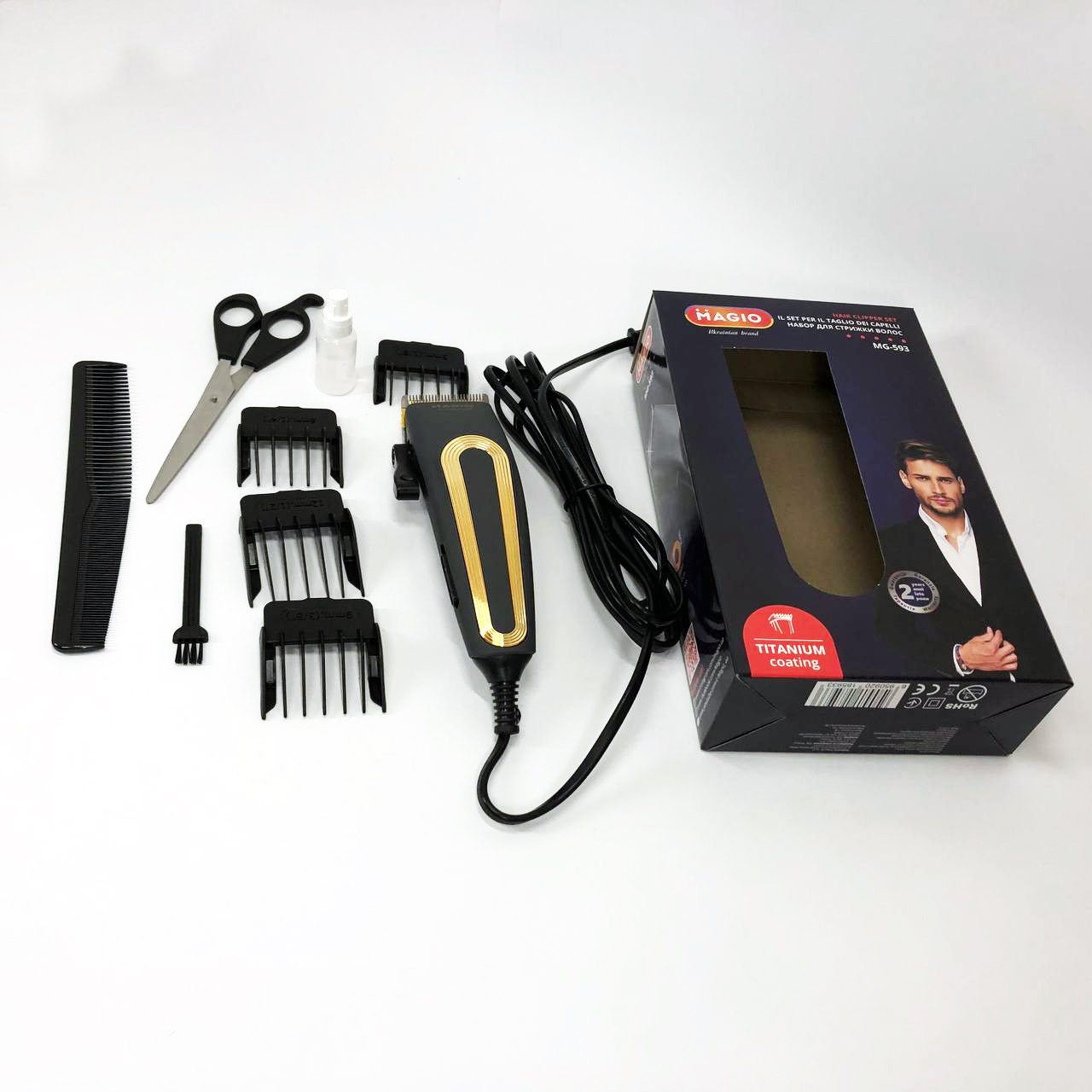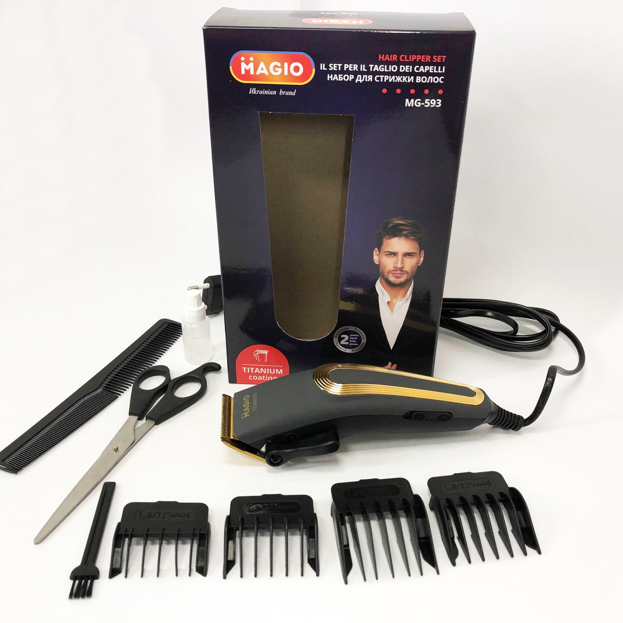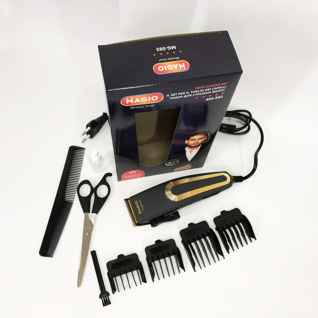Машинка для стрижки волосся Magio (MG-593) обладнана потужним двигуном потужністю 25 Вт і працює з низьким рівнем шуму. Лезо з покриттям титану забезпечує довговічність і точність стрижки. В комплект входять 4 насадки (3 мм, 6 мм, 9 мм, 12 мм), гребінець, ножиці, масло та щітка для догляду за пристроєм.
