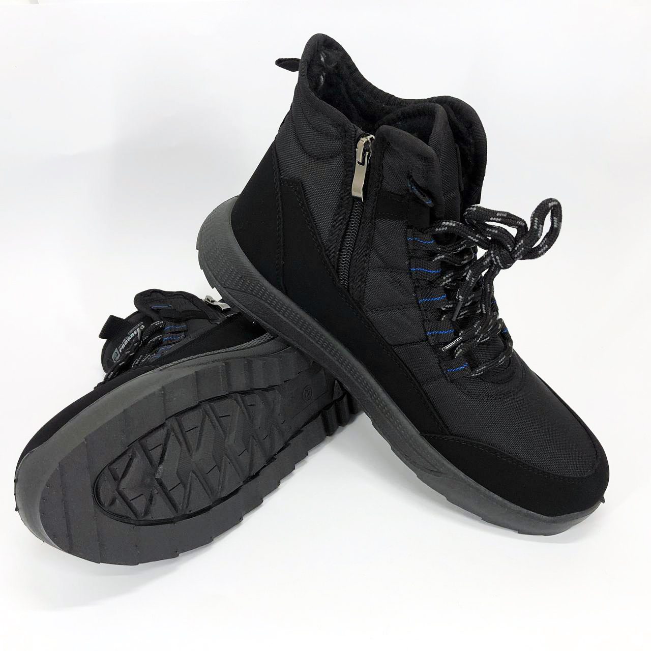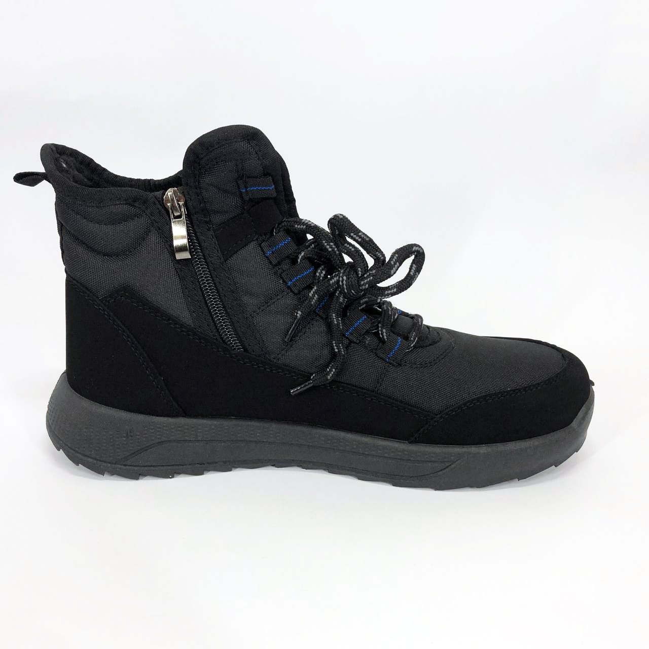 Черевики мають сучасний дизайн у темному кольорі з лаконічними синіми акцентами, що додають стилю. Гнучка підошва з рельєфною поверхнею добре амортизує та не ковзає, що робить взуття безпечним навіть на вологому або слизькому покритті. Ідеальний варіант для міста, прогулянок або подорожей у міжсезоння.