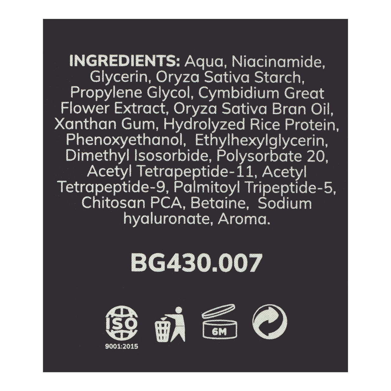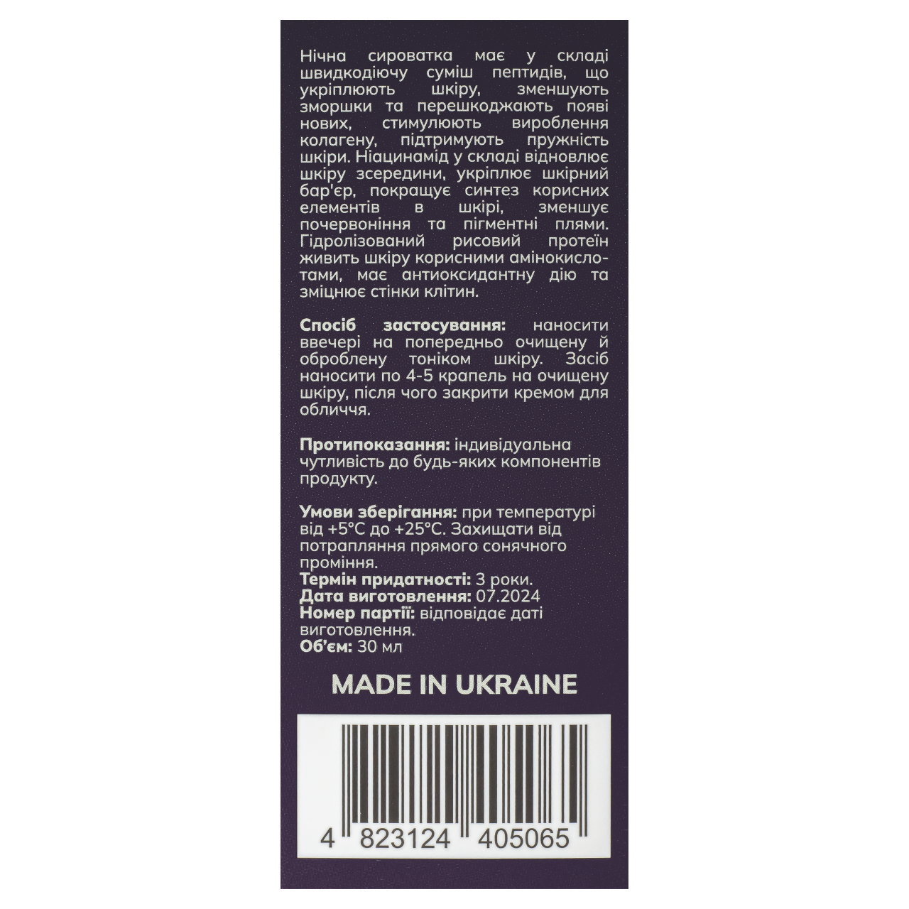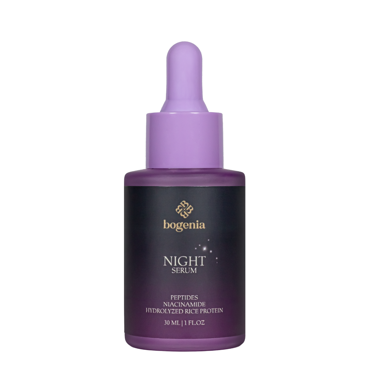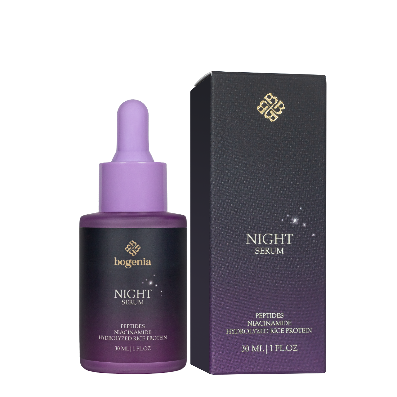 Сироватка для обличчя нічна антивікова Bogenia Night Serum з ніацинамідом і швидкодійними пептидамиСерум для обличчя від бренда косметики Bogenia завдяки своєму інноваційному складу зміцнює шкіру, зменшує глибину зморщок і запобігає появі нових, підвищує вироблення колагену, що відповідає за пружність шкіри.Активні компоненти діють під час сну, коли дерма найінтенсивніше відновлюється. До складу омолоджувальної сироватки для шкіри обличчя увійшли:ніацинамід — відновлює шкіру зсередини, зміцнює шкірний бар'єр, покращує вироблення шкірою корисних речовин, які підтримують її молодість і здоров'я, вирівнює тон шкіри, приховуючи видимість почервоніння й пігментних плям;гідролізований рисовий протеїн — живить шкіру корисними амінокислотами, знижує рівень окиснення шкіри, захищає клітини дерми від передчасного руйнування.Подаруйте своїй шкірі по-справжньому ефективний догляд із нічною сироваткою для обличчя Bogenia Night Serum!Спосіб застосування: Нанесіть сироватку на чисту шкіру обличчя, шиї, зону під очима перед сном. Далі скористайтеся своїм звичайним кремом.Об'єм: 30 мл