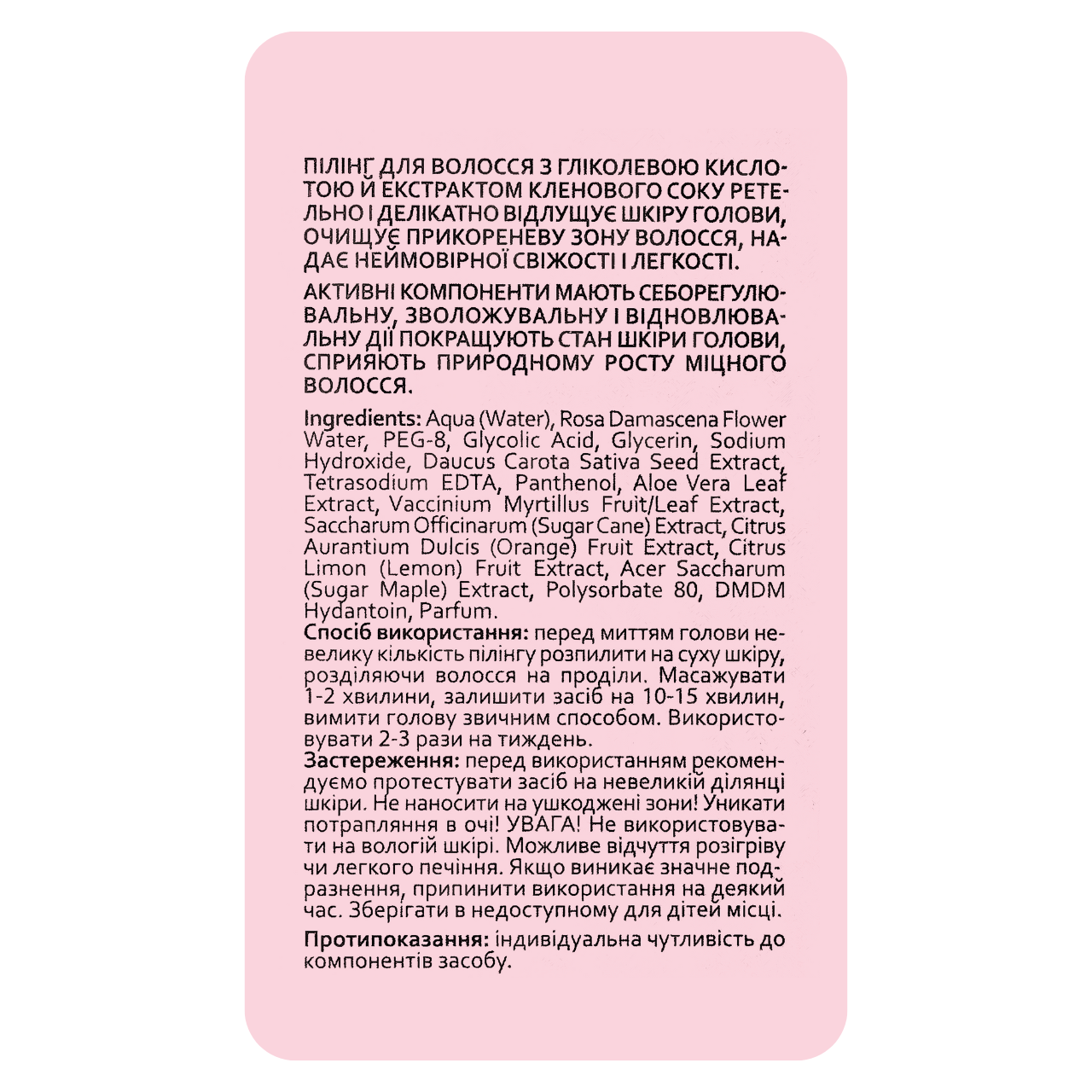екстракт кленового соку - усуває сухість волосся і відновлює їх структуру.Ефект після використання пілінгу:чиста шкіра голови без білих лусочок;
