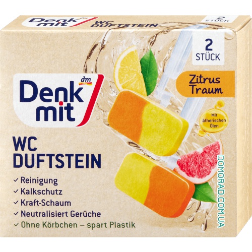 Ароматичний камінь Denkmit освіжає і очищає унітаз зверху вниз. Завдяки свіжому аромату лимона та грейпфрута, на додаток до ефективного захисту від вапняного нальоту, кімната також огортається чудовим ароматом.