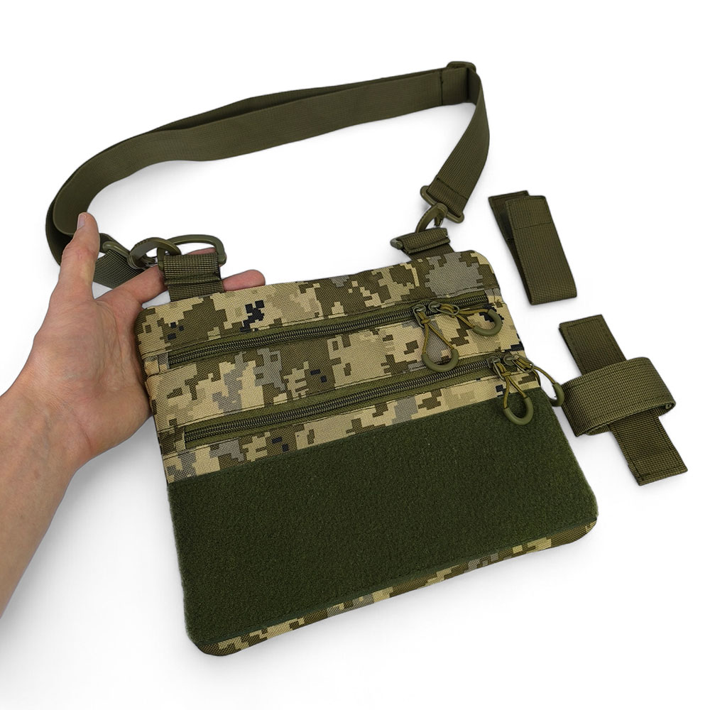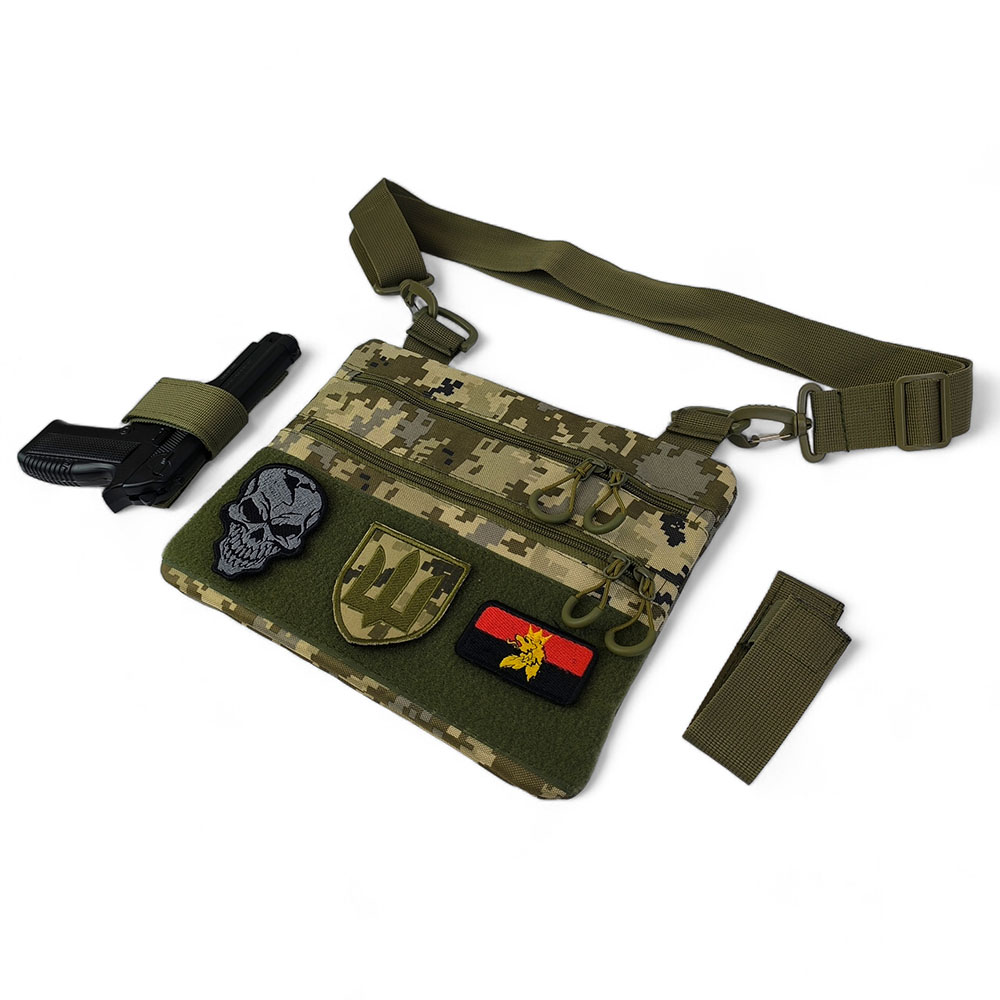 Ця тактична наплічна сумка-кобура з піксельним камуфляжем є ідеальним рішенням для скритого носіння пістолета. Виготовлена з високоякісної тканини кордура, вона забезпечує надійний захист вашого зброї та аксесуарів. Розмір сумки 30 х 24 см.