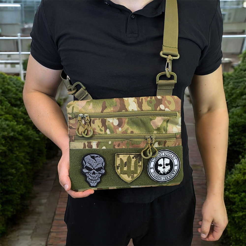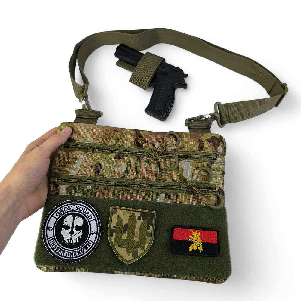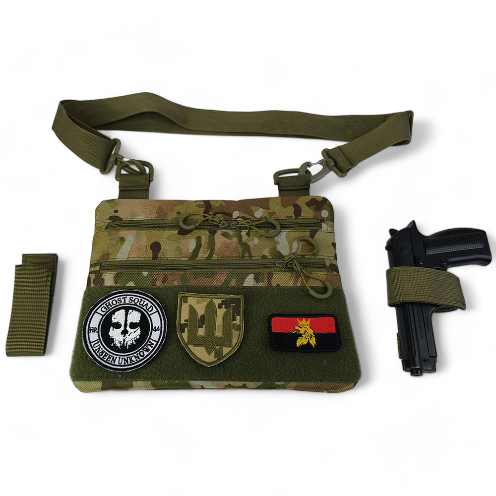 Ця стильна і функціональна тактична сумка-кобура з мультикам камуфляжем розроблена для безпечного і зручного носіння пістолета. Виготовлена з високоякісної кордура, вона забезпечує надійний захист і тривалий термін служби. Розмір сумки складає 30 х 24 см, що робить її компактною та місткою одночасно.