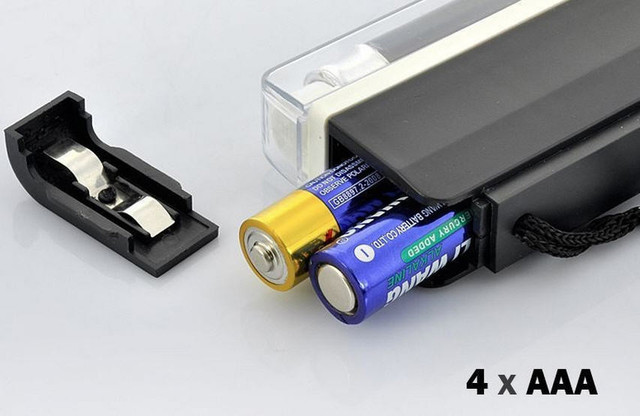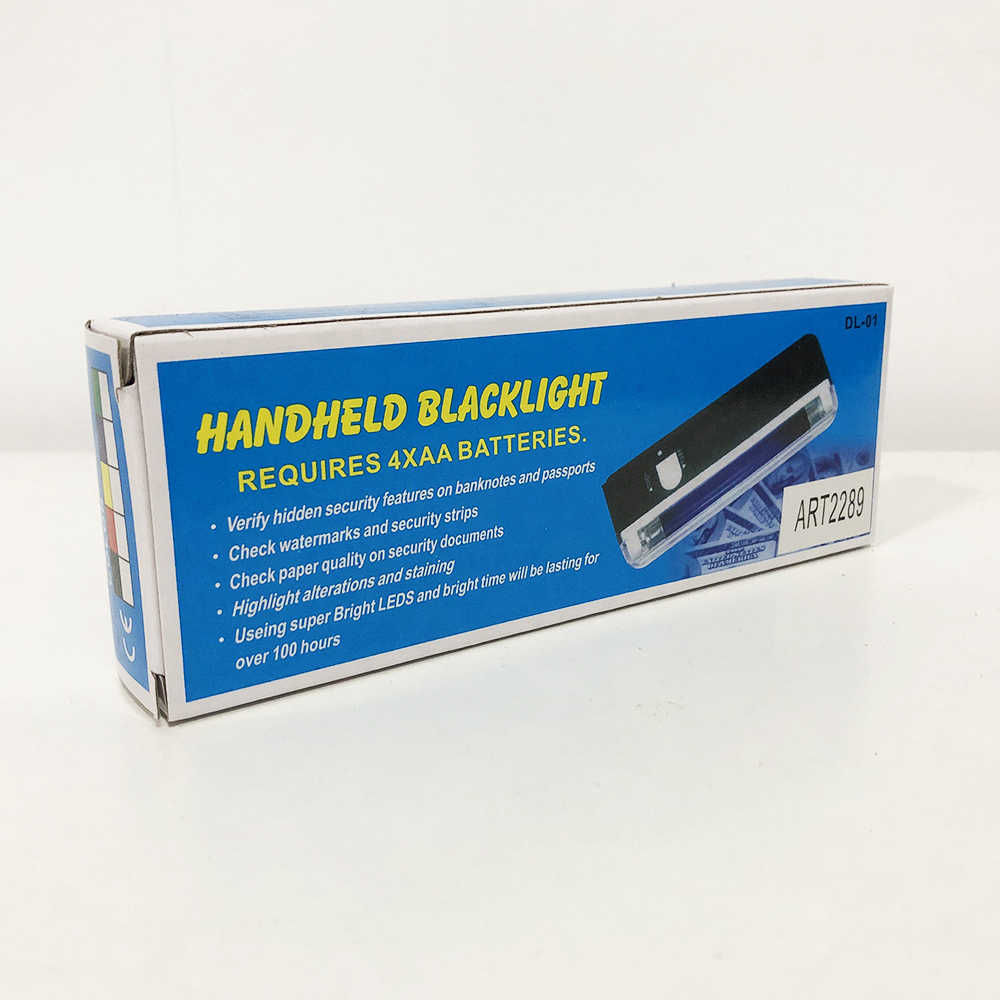 DL01 – портативний ультрафіолетовий детектор купюр, який призначений для оперативної перевірки банкнот та різних документів (права водіїв, технічні паспорти, посвідчення особи). Особливістю даної моделі є компактний розмір, який дозволяє постійно мати при собі даний пристрій. Крім того, детектор має на торці потужний світлодіод білого світіння і який також використовуватиметься для перевірки купюр і як звичайний ліхтарик. Корпус DL01 виготовлений із міцного пластику, працює детектор від 4 батарейок типу АА (не йдуть у комплекті).