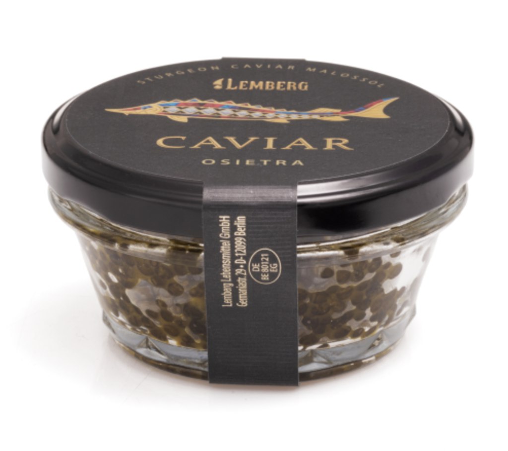 Осетрова ікра Lemberg Malossol - один з найдорожчих і найпопулярніших делікатесів у світі, символ вишуканого смаку і по-справжньому ексклюзивний продукт. Колір ікринок варіюється від темно-коричневого до сіро-чорного з золотистим відливом. Цей сорт ікри характеризується безпомилковим горіховим смаком і насиченим ароматом, розмір зерен варіюється від 1,5 мм до 2,00 мм.