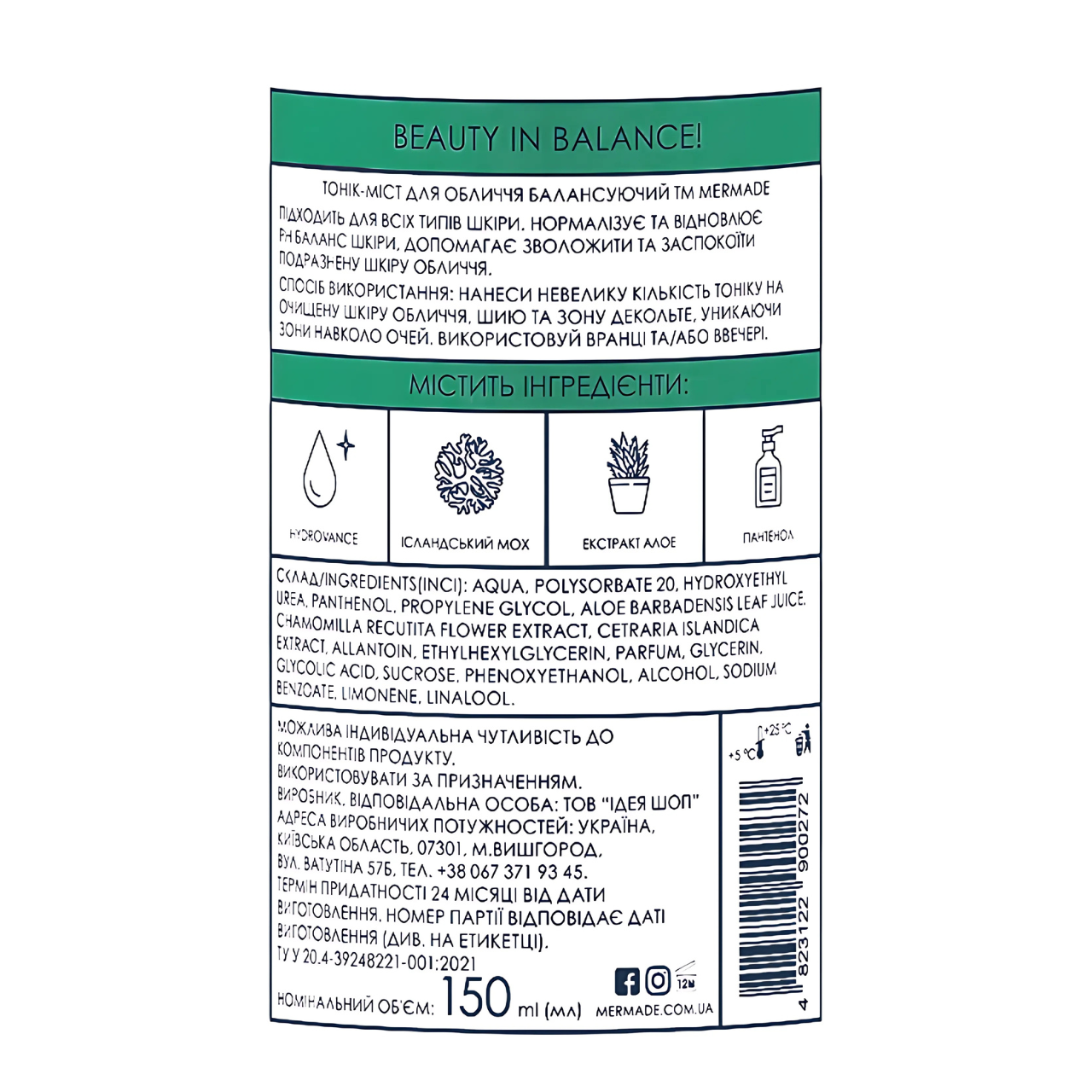 Тонік-міст для обличчя балансуючий Mermade Hydrovance & Iceland Moss Extract 150 мл