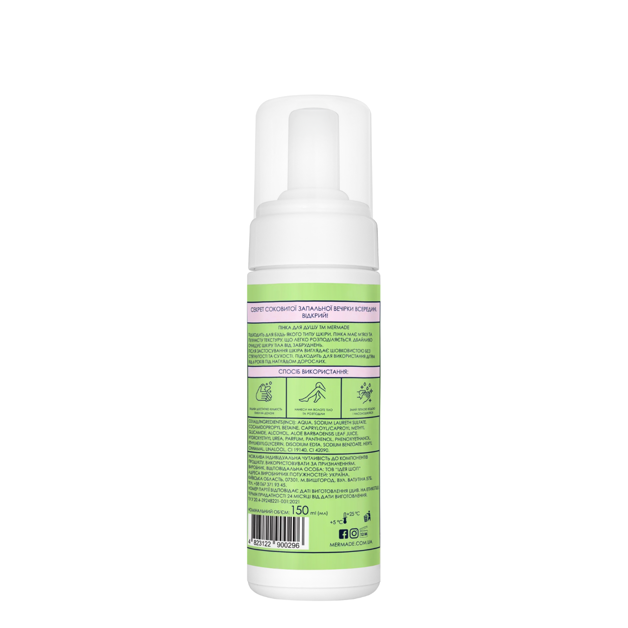 Зволожувальна парфумована пінка для душу Mermade What a Melon з ароматом "Кавун" для дорослих та дітей віком від 6 роківНіжний засіб для делікатного очищення тіла допомагає зробити шкіру гладкою та шовковистою, надає їй доглянутого вигляду. По-літньому соковитий аромат цукристого кавуна підвищує настрій із самого ранку і налаштовує на позитив під час вечірнього душу.Засіб відразу наноситься легкою приємною піною завдяки диспенсеру у кришці. Пінка підходить для всіх типів шкіри, і може застосовуватися дітьми віком від 6 років.Активні компоненти пінки для душу Mermade What a Melon:сік алое – зволожує, відновлює та допомагає загоювати шкіру;