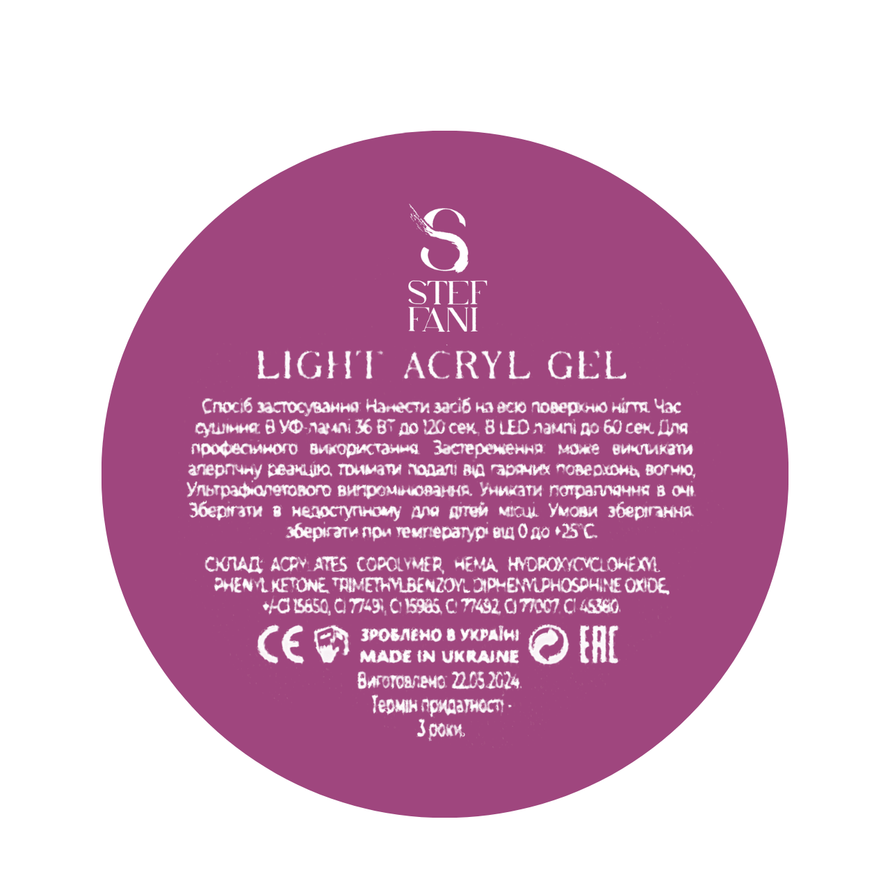 Камуфлюючий полігель для зміцнення нігтьової пластини Steffani Light Acryl Gel для тонких та чутливих нігтівLight Acryl Gel Steffani – колекція рідких гелів, призначених для зміцнення нігтьової пластини. Завдяки низькій кислотності рідкі акрилові гелі абсолютно безпечні для нігтів. Вони підходять для тонких та чутливих нігтів, мають середню консистенцію. Ідеально розгладжують та зміцнюють як короткі, так і довгі нігті. акриловий гель не деформується під час носіння та зберігає свій повний блиск до корекції.Спосіб застосування:Виконайте стандартну підготовку нігтя. Після чого рекомендується очистити нігтьову пластину за допомогою знежирювального засобу Prep&Finish Steffani.