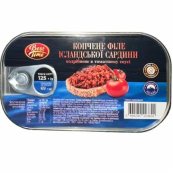 - Скумбрія (Scomber scombrus) (60%), томатний соус (вода питна, томатна паста, олія рослинна (ріпакова або соняшникова), цибуля сушена, сіль кухонна, регулятор кислотності - оцтова кислота, чорний перець, духмяний перець, гвоздика, коріандр, лавровий лист) (40%)