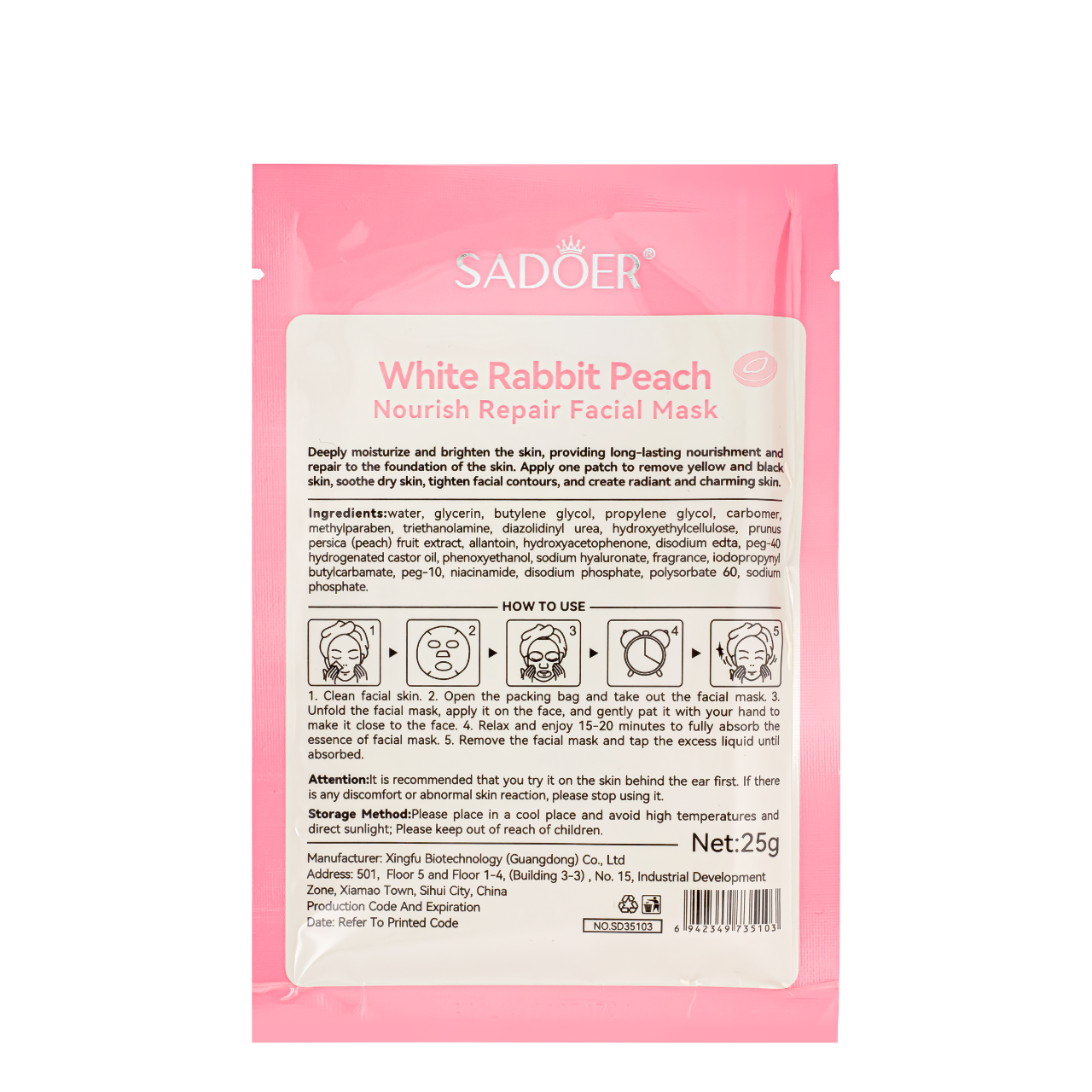 Поживна відновлювальна маска для обличчя Sadoer Animal Fruit Rabbit Peach Facial Mask з екстрактом персика та ніацинамідомЦя бюджетна тканинна маска з потужним коктейлем корисних інгредієнтів живить, відновлює, глибоко зволожує шкіру обличчя, має вибілювальну та омолоджувальну дію.Засіб для догляду за обличчям допомагає вирівняти тон шкіри, усуваючи вікові пігментні плями. Завдяки глибокому зволоженню маска згладжує і зміцнює дерму, робить її еластичною та насиченою.З Animal Fruit Rabbit Peach Facial Mask ваша шкіра знову набуде сяйво молодості. Одного застосування перед важливим виходом у світ буде досить, щоб освіжити дерму та навіть після виснажливого робочого дня мати вигляд, як після СПА-салона.Активні компоненти маски для обличчя:гліцерин — зволожує шкіру, утримуючи вологу та надаючи їй гладкість і м'якість.;