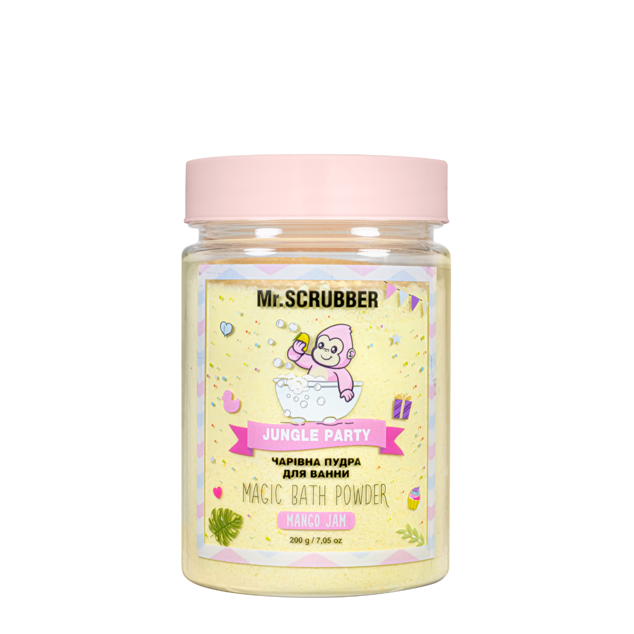Пудра для прийняття ванни Mr. Scrubber Jungle Party для дорослих і дітей від 3 років (жовта)Чарівна пудра з мавпочкою на флаконі зробить прийняття не тільки корисним, але й захопливим, цікавим для дітей для дорослих! Засіб для купання має делікатний і безпечний склад, тому підійде дітям від 3 років. Пудра фарбує воду у ванній в гарний жовтий колір, тому дитина буде в захваті від водних процедур, які не завжди їй подобаються.Ніжний аромат манго додасть бажання зануритися в наповнену пудрою ванну та довше там залишатися. Завдяки гіпоалергенному та делікатному складу засіб абсолютно безпечний для дитячого організму та чутливої шкіри. До того ж, після купання у ванній із розчиненою пудрою шкірний покрив стає м'яким, гладким, немов шовк.Активні компоненти пудри для ванни Jungle Party від Mr. Scrubber:кукурудзяний крохмаль — гіпоалергенний, безпечний, пом'якшує й захищає шкіру малюка;