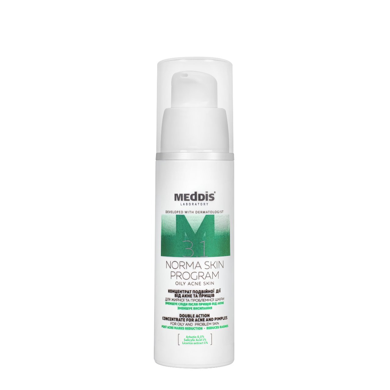 Засіб проти акне та прищів Meddis Norma Skin подвійної дії для жирної шкіри обличчяЗасіб подвійної дії Meddis — ваш помічник у боротьбі з акне та недосконалостями шкіри! Формула концентрату ефективно зменшує висипки та усуває сліди постакне, даруючи вашій шкірі шанс мати ідеальний вигляд. З кожним застосуванням ви помічаєте, як прищів стає менше, а шкіра стає гладкою, сяйною й рівною. Забудьте про коригувальні засоби та тональні креми — тепер ваша шкіра прекрасна та без них! Концентрат Meddis підходить для дорослих і підлітків віком від 10 років.Дієві інгредієнти, які піклуються про вашу шкіру: