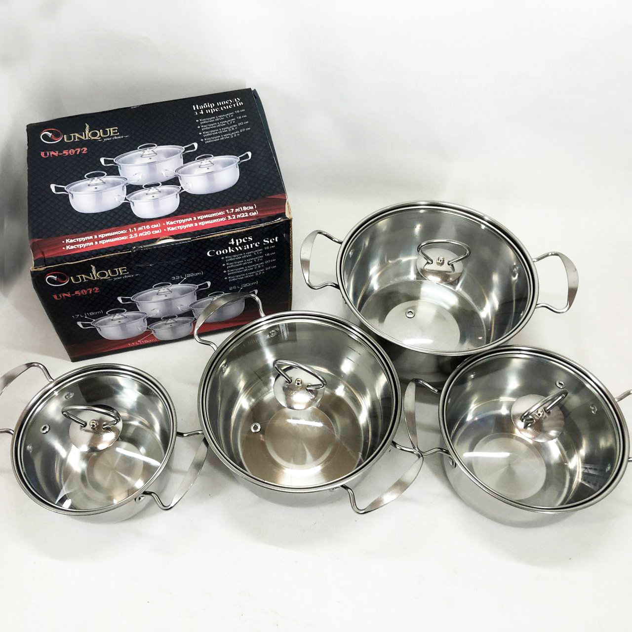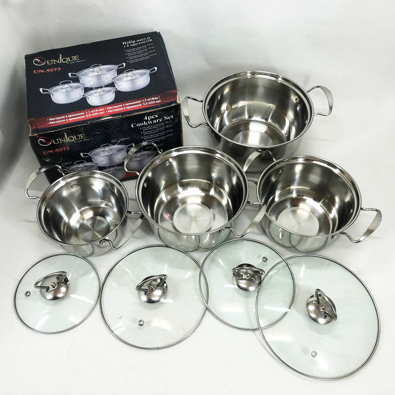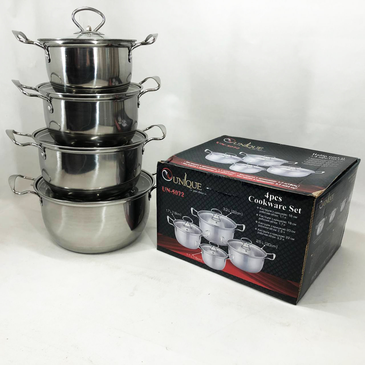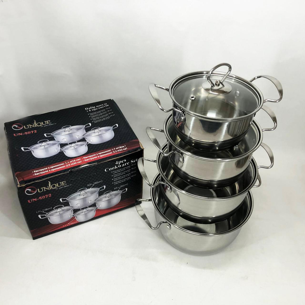 Набір каструль високоякісний UNIQUE UN-5072 8 предметів (1.3/ 1.7/ 2.4/ 3.9 л.) – 4 каструлі з кришками з нержавіючої сталі