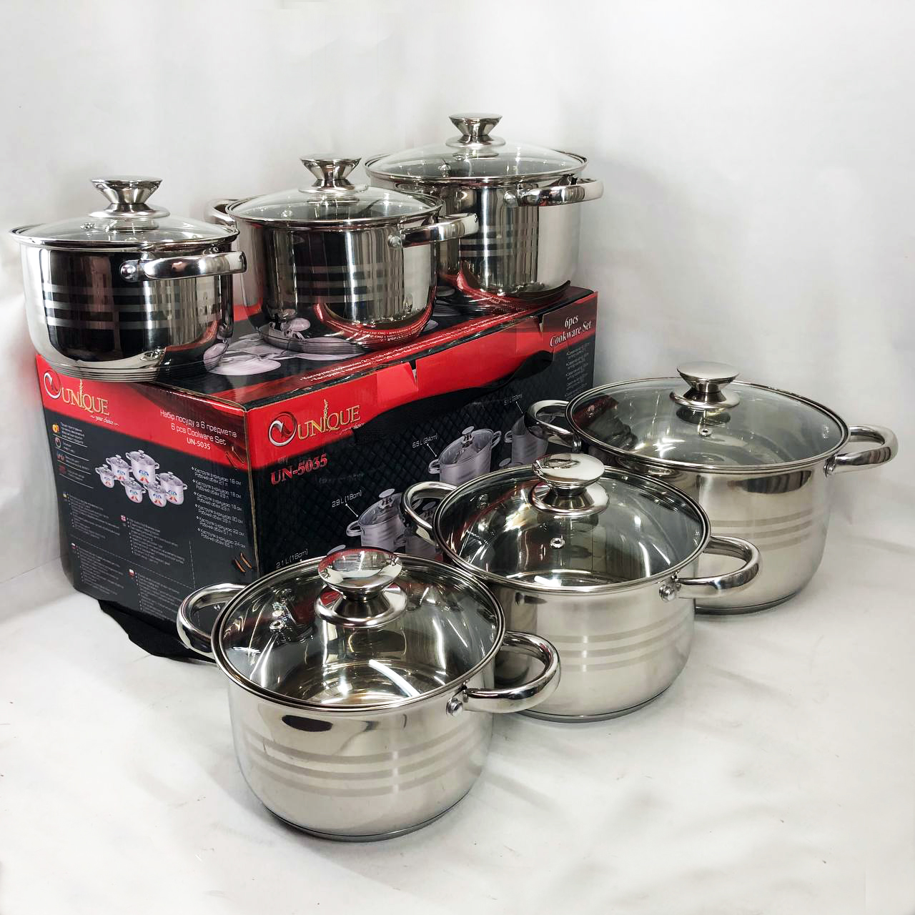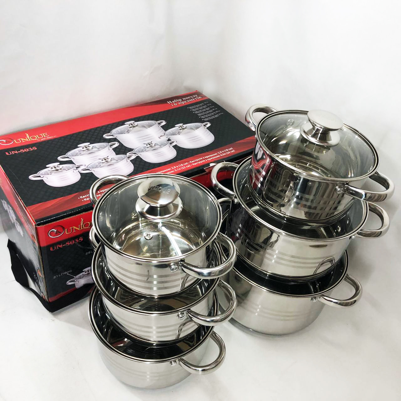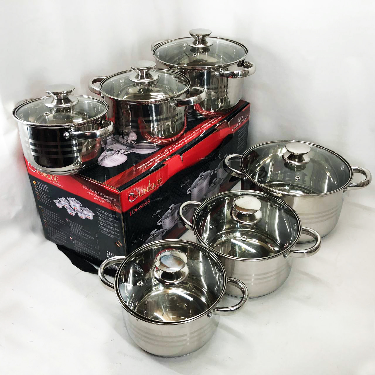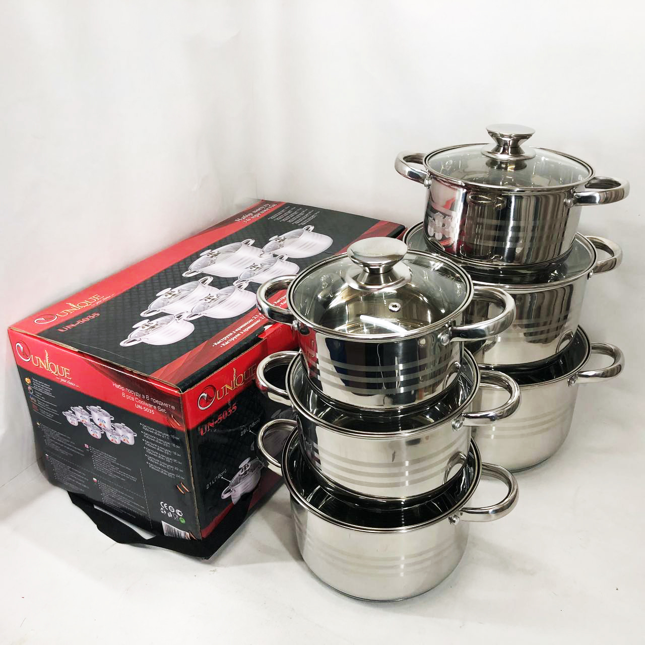 Набір каструль UNIQUE UN-5035 з нержавіючої сталі з товстим дном в 5 шарів з кришками, 12 предметів