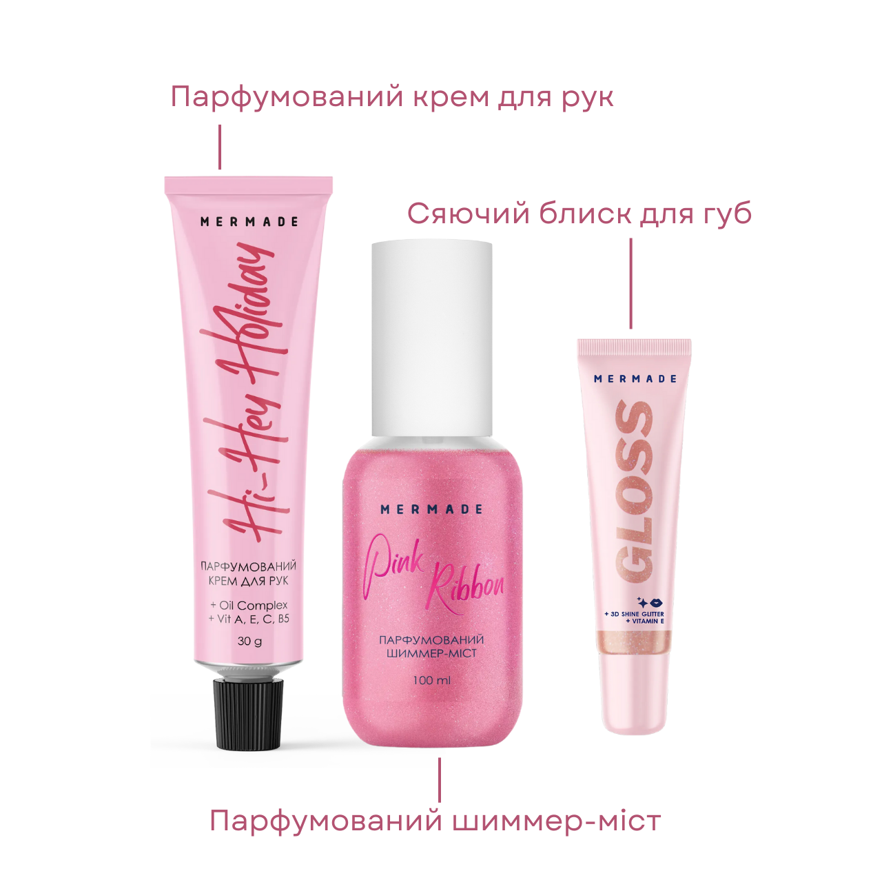 Набір жіночої косметики для тіла 3 в 1 Mermade Diamond "You're a Real Gem"Подарунковий б'юті-бокс Mermade "You're a Real Gem" — ідеальний спосіб сказати найкращій подрузі, яка завжди поруч: "Як же мені пощастило, що ти є в своєму житті!". До складу входить 3 косметичні засоби, які завжди припадуть до душі будь-якій красуні.Тому Mermade Diamond "You're a Real Gem" стане ідеальним подарунком кожній жінці, дівчині на Новий рік, Різдво і День народження. Ефектна коробочка у формі діаманта підкреслює цінність скарбів, захованих усередині.Склад подарункового набору для догляду за тілом Mermade Diamond "You're a Real Gem"Парфумований шимер-міст для тіла Mermade Pink Ribbon (100 мл)Це ніжне рожеве світіння й аромат, який огортає вас теплом і затишком. Свіжі ноти райського яблука додають бадьорості, бергамот — вишуканості, а солодкий відтінок створює м'який шлейф, який залишиться в пам'яті надовго.Сяйний блиск для губ Mermade Rose Gloss (10 г)Блиск дарує усмішці витончене персикове сяйво. Легка зволожувальна текстура робить губи м'якими та доглянутими, додаючи кожній усмішці магічності, перед якою неможливо встояти.Парфумований крем для рук Mermade Hi-Hey Holiday (30 мл)Композиція парфумірвоаного крему розкривається ароматами конвалії, мускусу й апетитної малини. Теплі ноти сандалу, ванілі та загадкових пачулів завершать композицію, залишаючи відчуття затишку та гармонії на весь день. А ще цей крем робить шкіру ваших рук м'якою, ніжною й шовковистою.