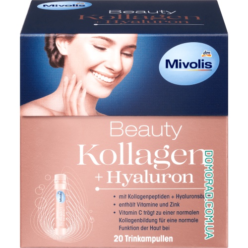 Mivolis Beauty Collagen зі смаком граната і жасмину містить поживний комплекс колагенових пептидів VERISOL®, вітаміни Е, С, ніацин, пантотенову кислоту та біотин, а також мікроелемент цинк. Ампули для пиття містять добірні мікроелементи: вітамін С сприяє нормальному утворенню колагену для нормального функціонування шкіри. Вітамін С, а також вітамін Е беруть участь у захисті клітин від окисного стресу. Ніацин, біотин і цинк допомагають підтримувати нормальну шкіру. Справжня краса приходить зсередини. Mivolis Beauty Collagen містить науково перевірені колагенові пептиди VERISOL®, які сприяють красивій шкірі та сяючому вигляду. Пептиди колагену підтримують більш пружний вигляд шкіри та, як було доведено, допомагають покращити еластичність шкіри та зменшити глибину зморшок.