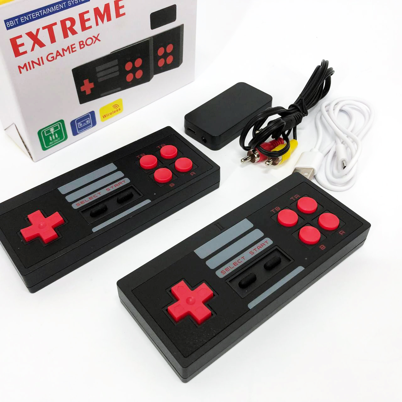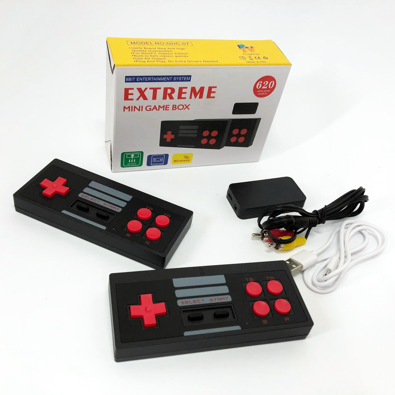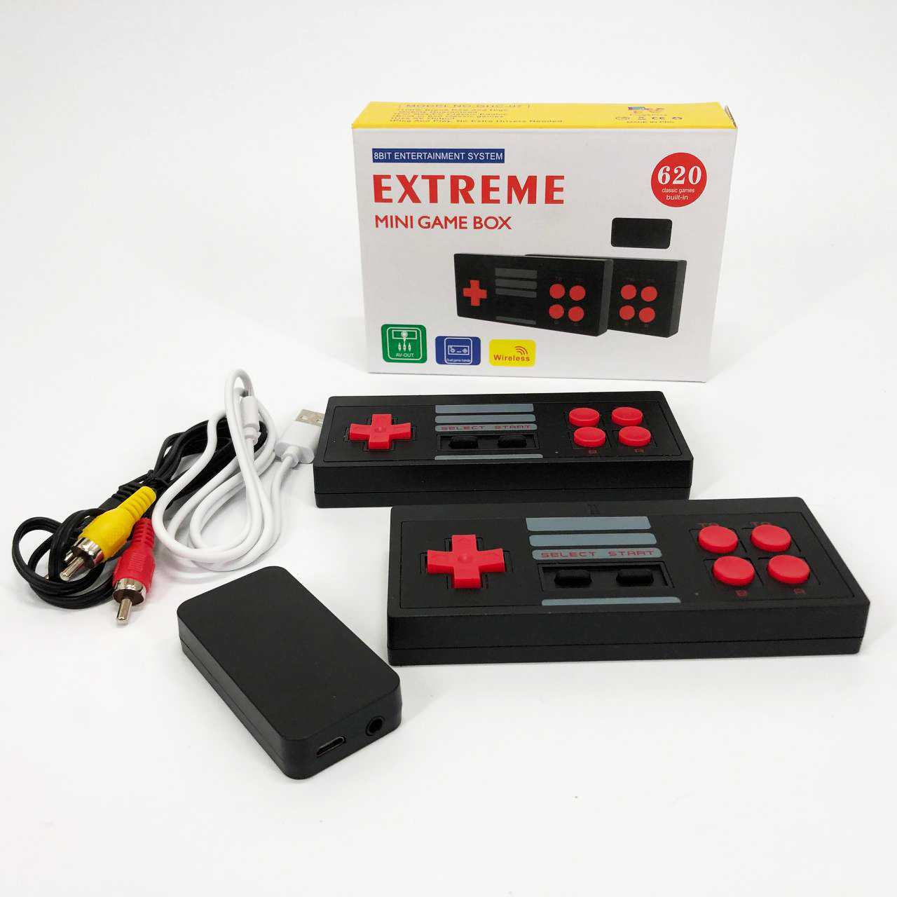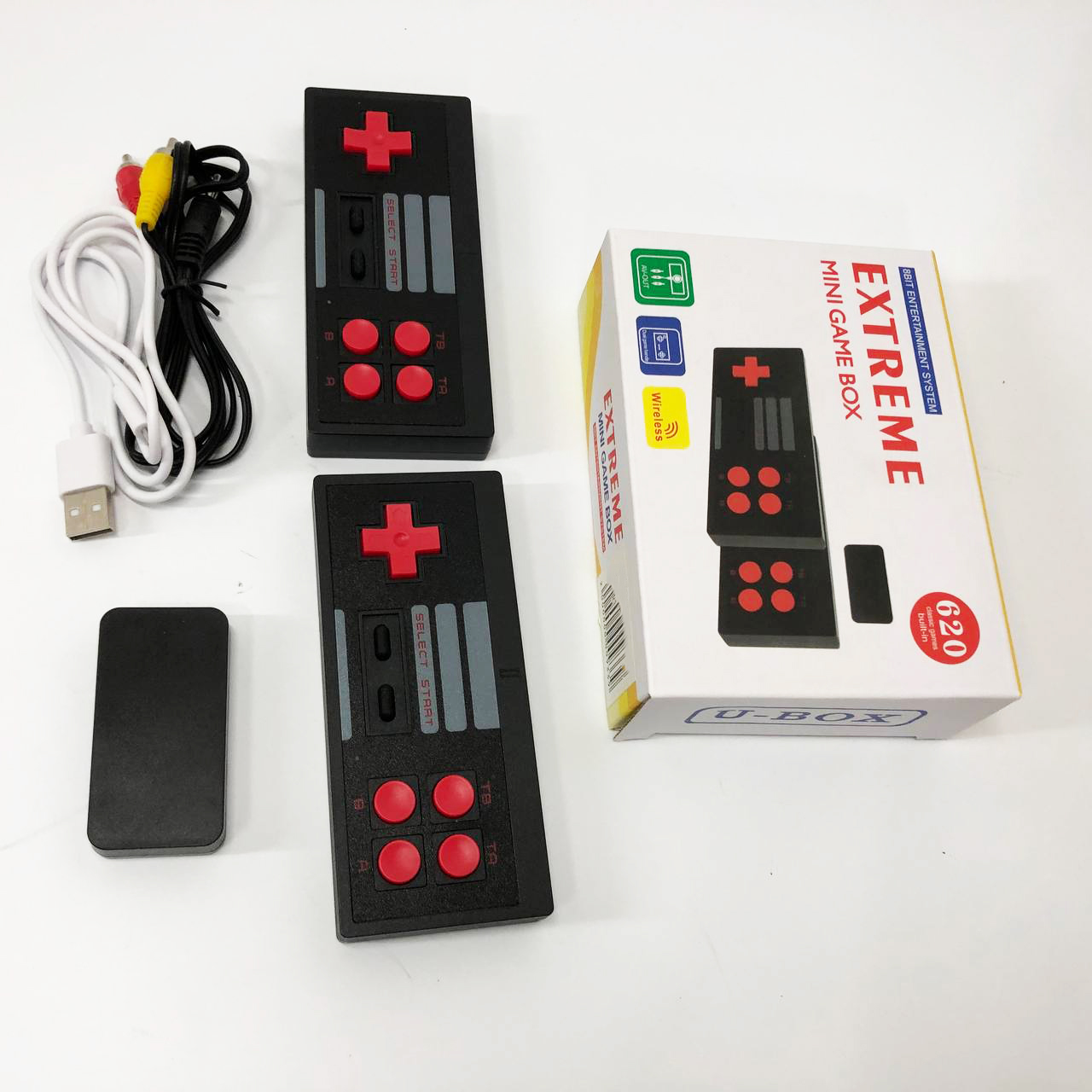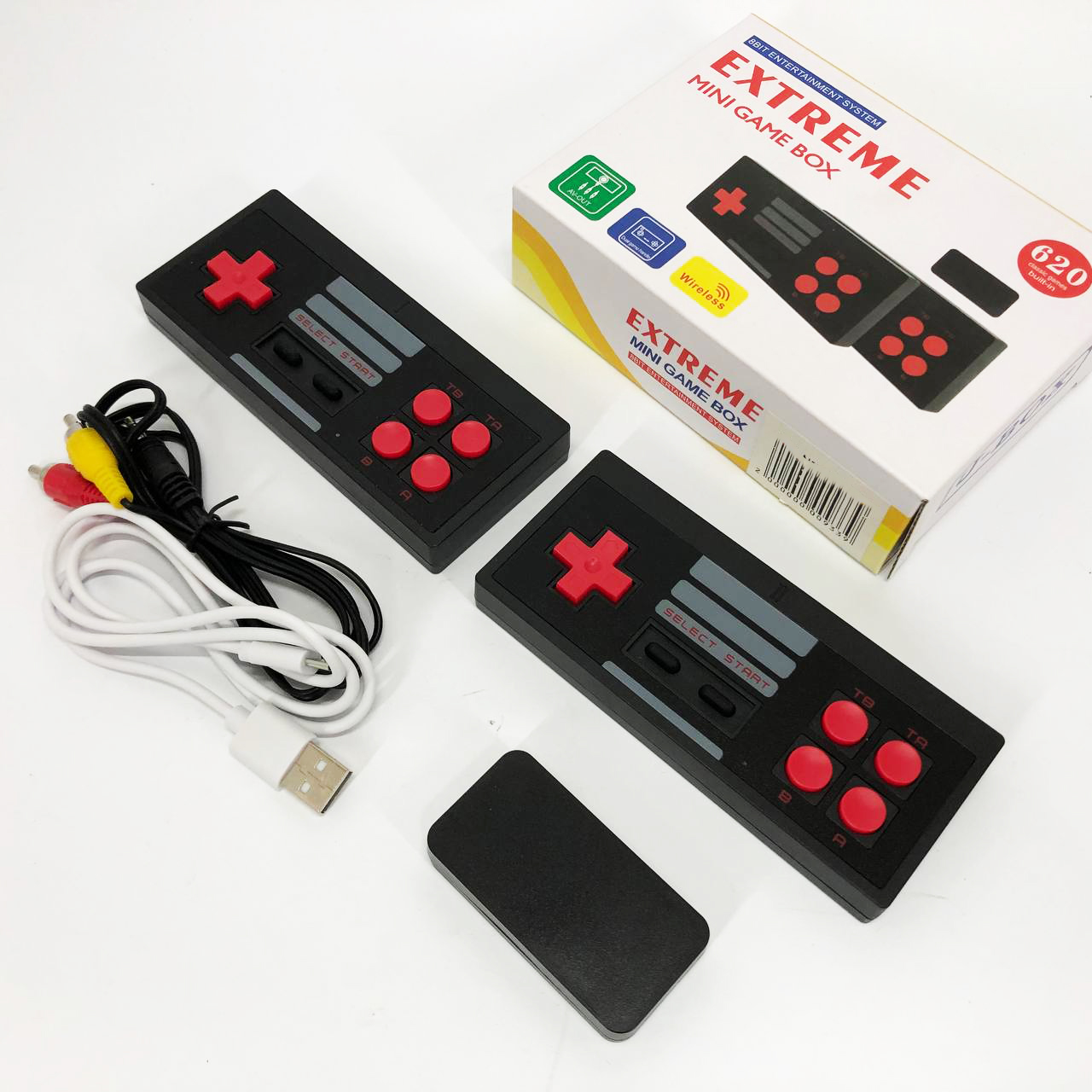 Extreme Game Box – це 8-бітна приставка у супер зручному виконанні. Вставляється безпосередньо в телевізор/монітор без додаткового місця. Дозволить згадати дитинство із мінімальними витратами. У комплекті 2 бездротових геймпади, працюють від 2 батарейок типу ААА, У комплект поставки не входять!! Інтерфейс підключення приставки AV-OUT. Так само для живлення самої приставки в комплекті присутній кабель USB – microUSB. Саму приставку вставляємо у роз’єм AV-OUT у телевізор чи монітор. Підключаємо додатковий кабель живлення до приставки та другий кінець кабелю живлення з виходом USB вставляємо у відповідний вихід USB на телевізорі. Або блок живлення від будь-якого телефону. Інформація про ігри – 620 ігор.