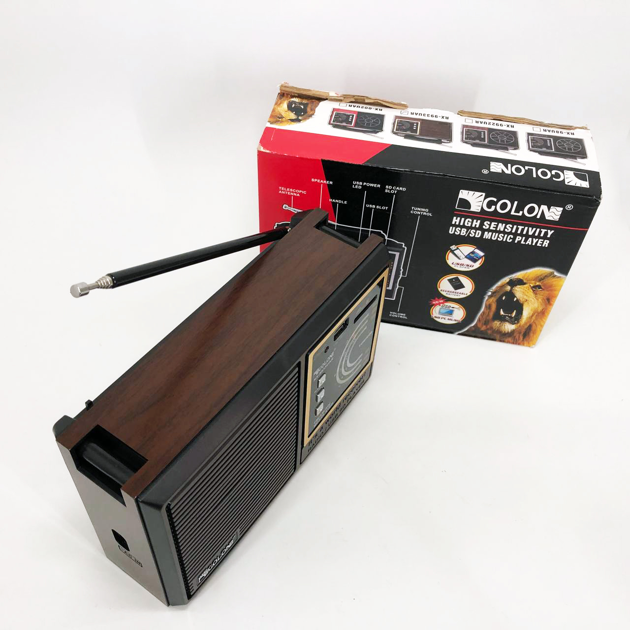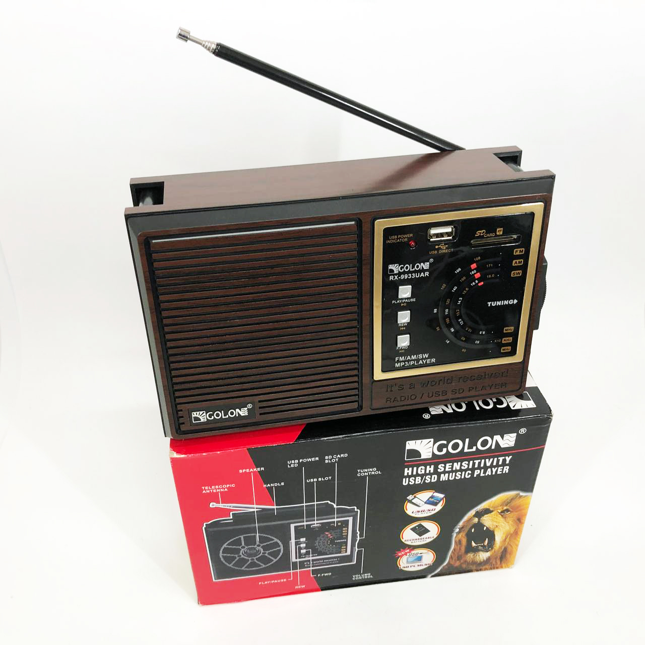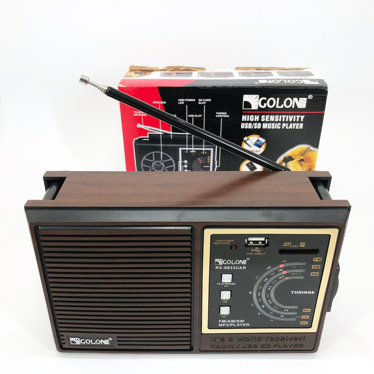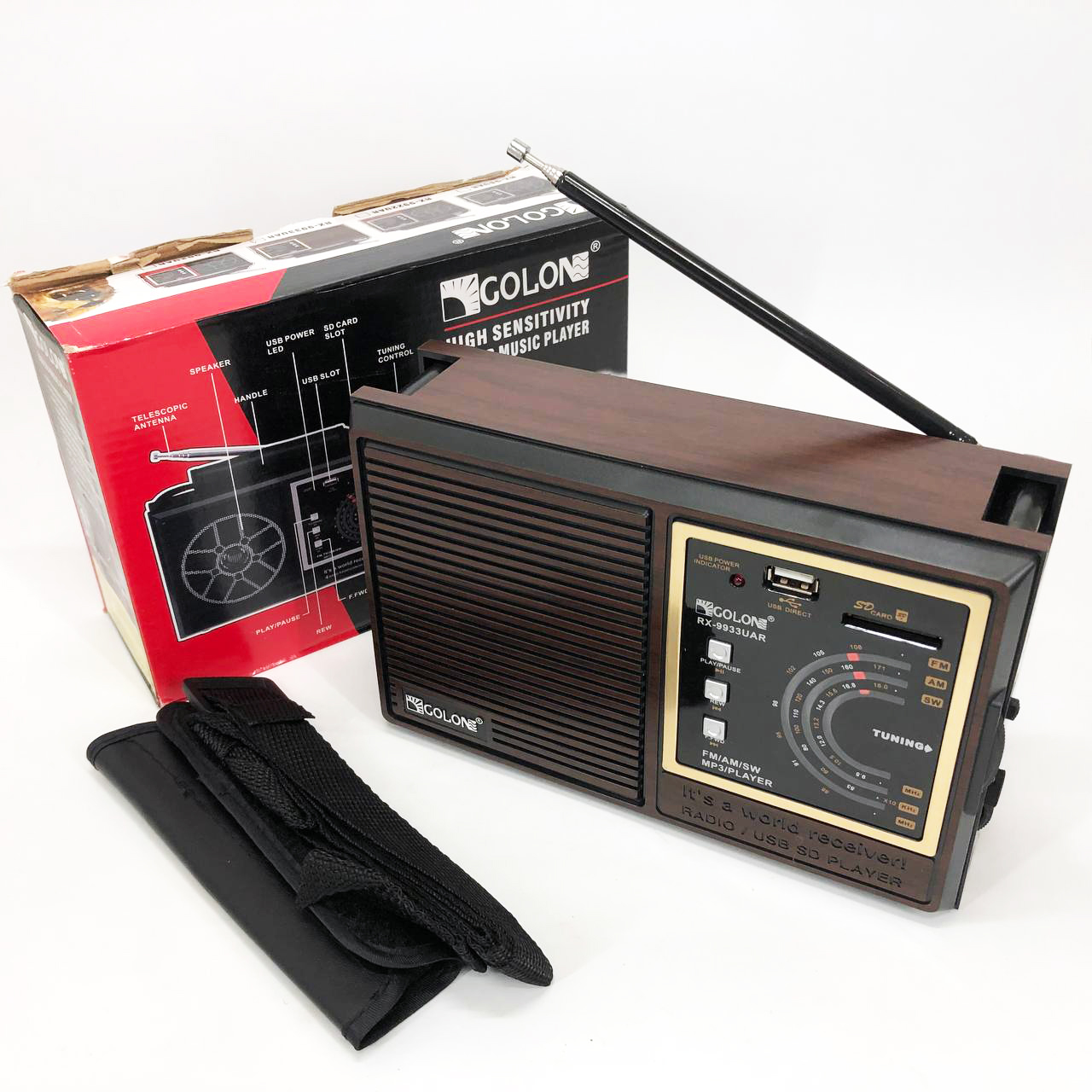 Радіоприймач торгової марки Golon, модель: RX-9933UAR. Має стильний дизайн ретро. Вбудований динамік центром (дуже гучний звук). Вбудований акумулятор дозволить взяти з собою в дорогу, де немає розетки. Також є відсік для батарей. USB/SD слоти дозволять відтворювати улюблену музику та аудіокниги з флеш накопичувачів у MP3 форматі.