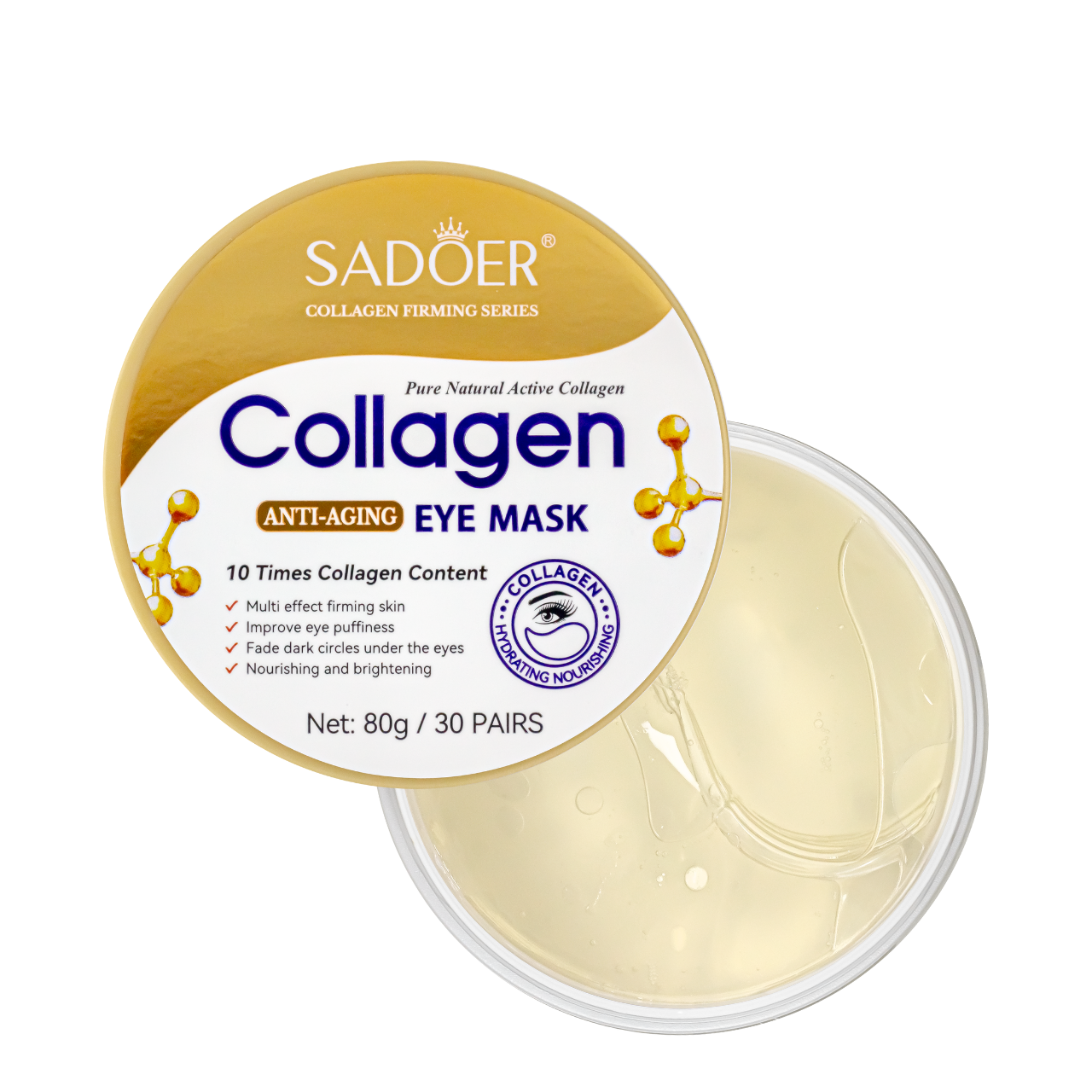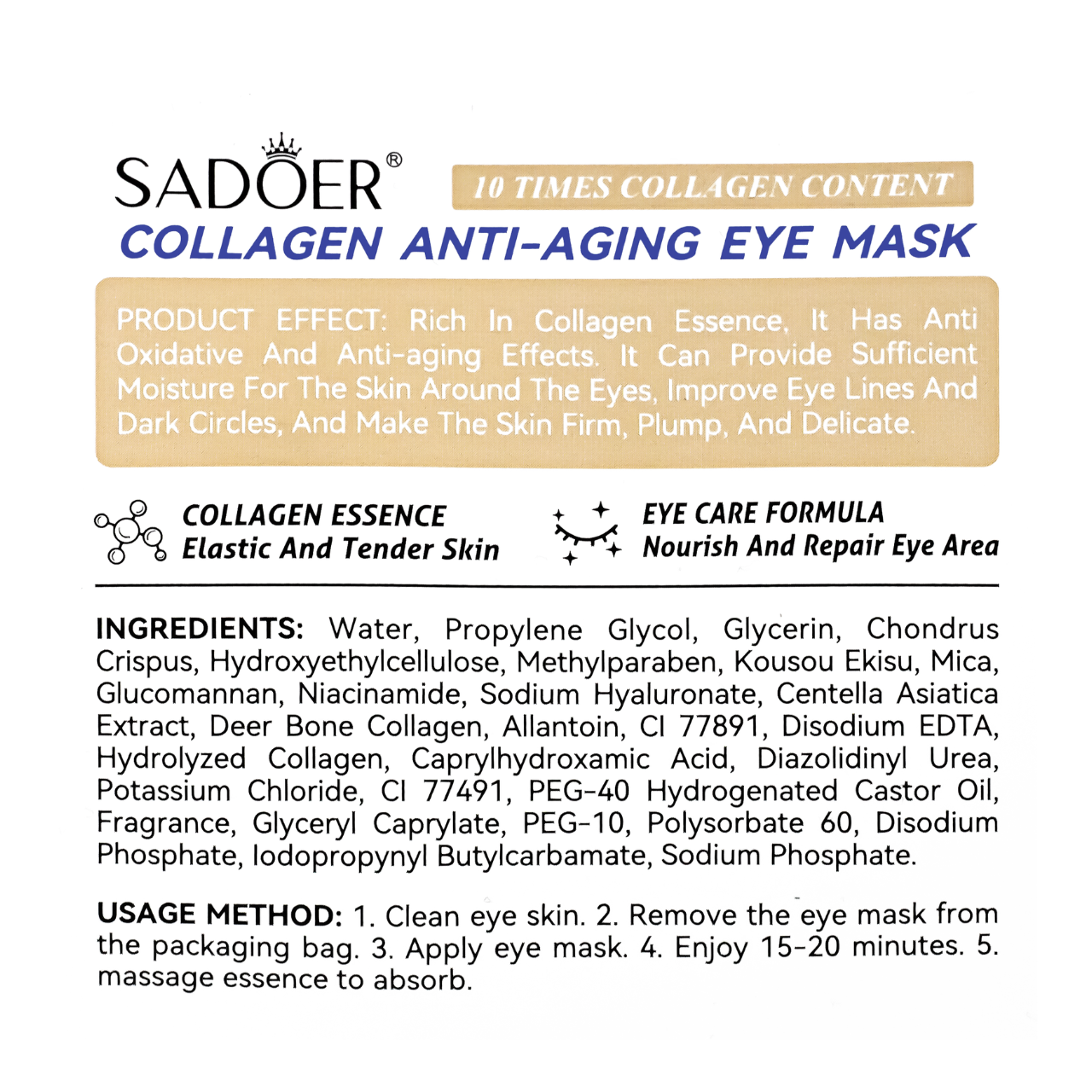 Патчі для повік з натуральним активним колагеном Sadoer Collagen Anti-Aging Eye MaskОмолоджувальні патчі для повік Sadoer Collagen з 10-кратним вмістом колагену — це ефективний засіб для догляду за шкірою навколо очей. Активний колаген інтенсивно зміцнює і відновлює шкіру навколо очей, зменшуючи видимість зморщок і повертаючи пружність. Патчі мають мультиефект, забезпечуючи комплексний догляд за чутливою до вікових змін шкірою повік.Переваги гідрогелевих антивікових патчів Sadoer Collagen Anti-Aging Eye Mask:багатофункціональний ефект: зміцнюють і відновлюють шкіру; зменшують набряки навколо очей; освітлюють темні кола під очима; живлять і зволожують тонку шкіру повік; згладжують зморшки, роблячи шкіру гладкішою та молодшою.Ці бюджетні гідрогелеві патчі для повік ідеально підходять для омолодження й догляду за шкірою навколо очей, роблять її свіжою та сяйливою.Спосіб застосування:За допомогою лопатки витягніть патчі для повік із контейнера. Накладіть маску під очі. Залиште на 15-20 хвилин. Зніміть патчі та вбийте залишки емульсії в шкіру повік.Кількість у пакунку: 60 шт., або 30 пар