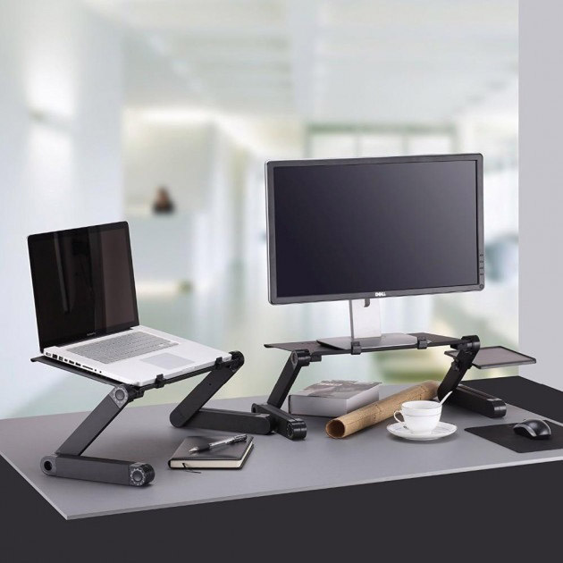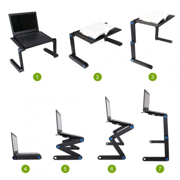 - Зроблений із сплаву алюмінію. Цей матеріал вибраний не випадково – він дозволяє приймати будь-яку форму столика, також краще дозволяє повітря циркулювати, коли ноутбук стоїть на ньому;