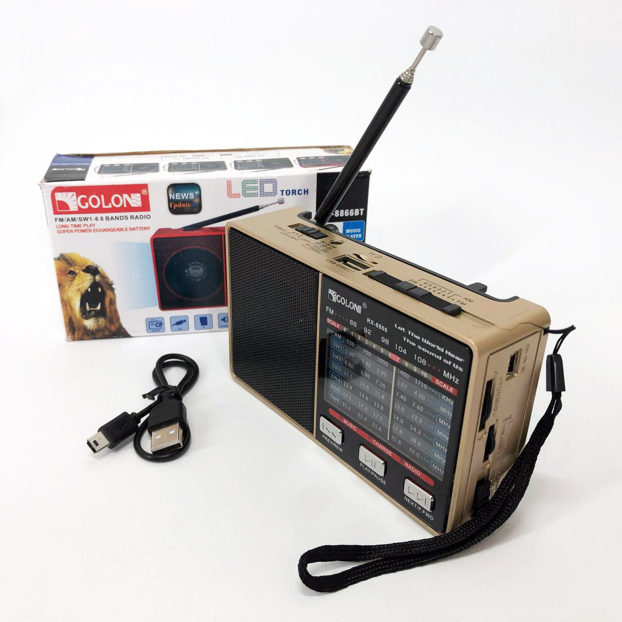 Портативний динамік / радіо / колонка Golon RX8866BT (8868) – дозволить слухати улюблену музику з будь-якого носія: c USB флешки, карти пам’яті SD чи станції FM радіо. Ця модель приймача має чудову якість прийому, навіть у віддалених місцях. Широкий крок між радіостанціями легко налаштуватися на ту чи іншу частоту