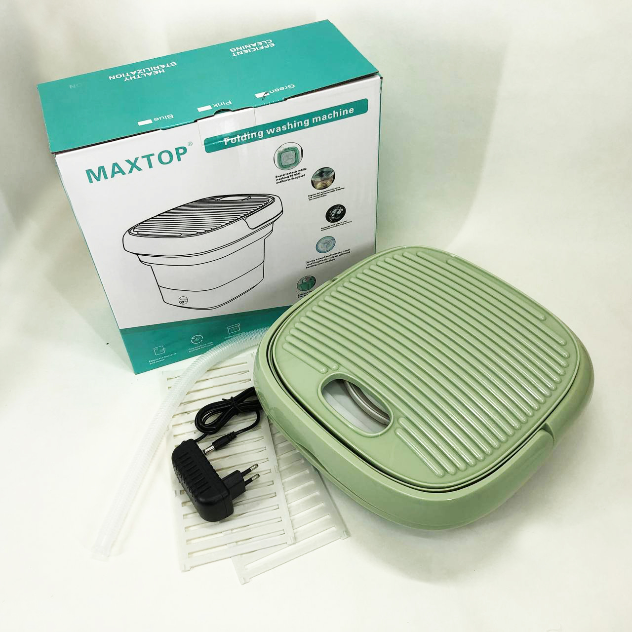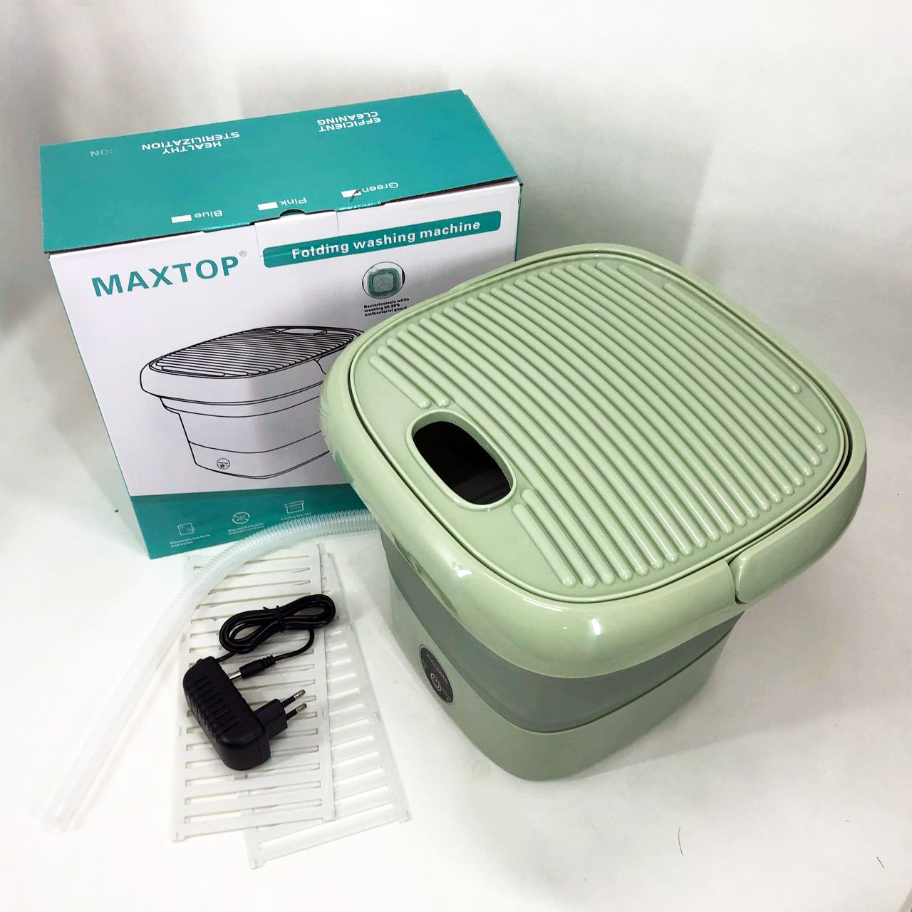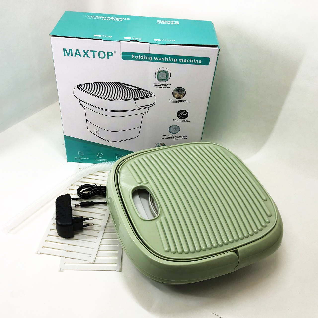Ця модель портативної пральної машини завдяки системі складання (у вигляді гармошки) стискається до 105 мм. Конструкцією передбачено ручку, за допомогою якої Maxtop silicon washing machine зручно переносити в руці. Ребристу кришку можна використовувати для додаткового прання.
