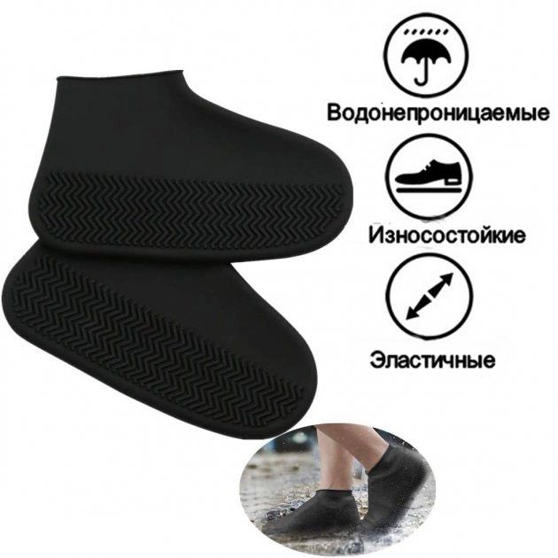 Багаторазові бахіли-чохли L (41-45 розмір) для взуття силіконові від води та бруду. Колір: чорний