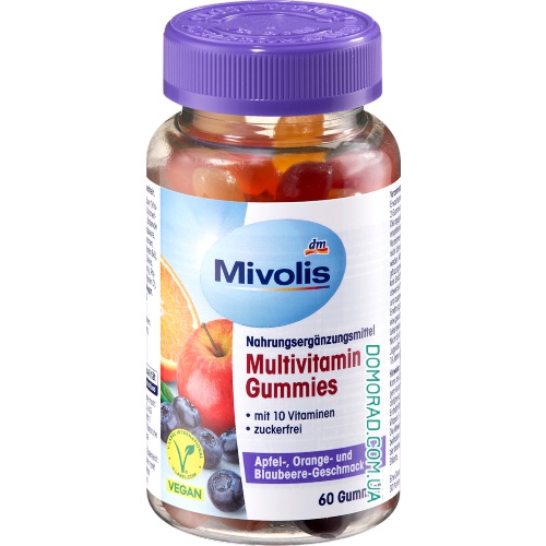Жувальні цукерки Mivolis Multivitamin Gummies містять 10 спеціально відібраних вітамінів і вражають своїм фруктовим смаком яблука, апельсина та чорниці. Смачні клейкі краплі складаються з вітамінів A, B2, B6, B12, C, D і E, а також містять ніацин, біотин і фолієву кислоту.