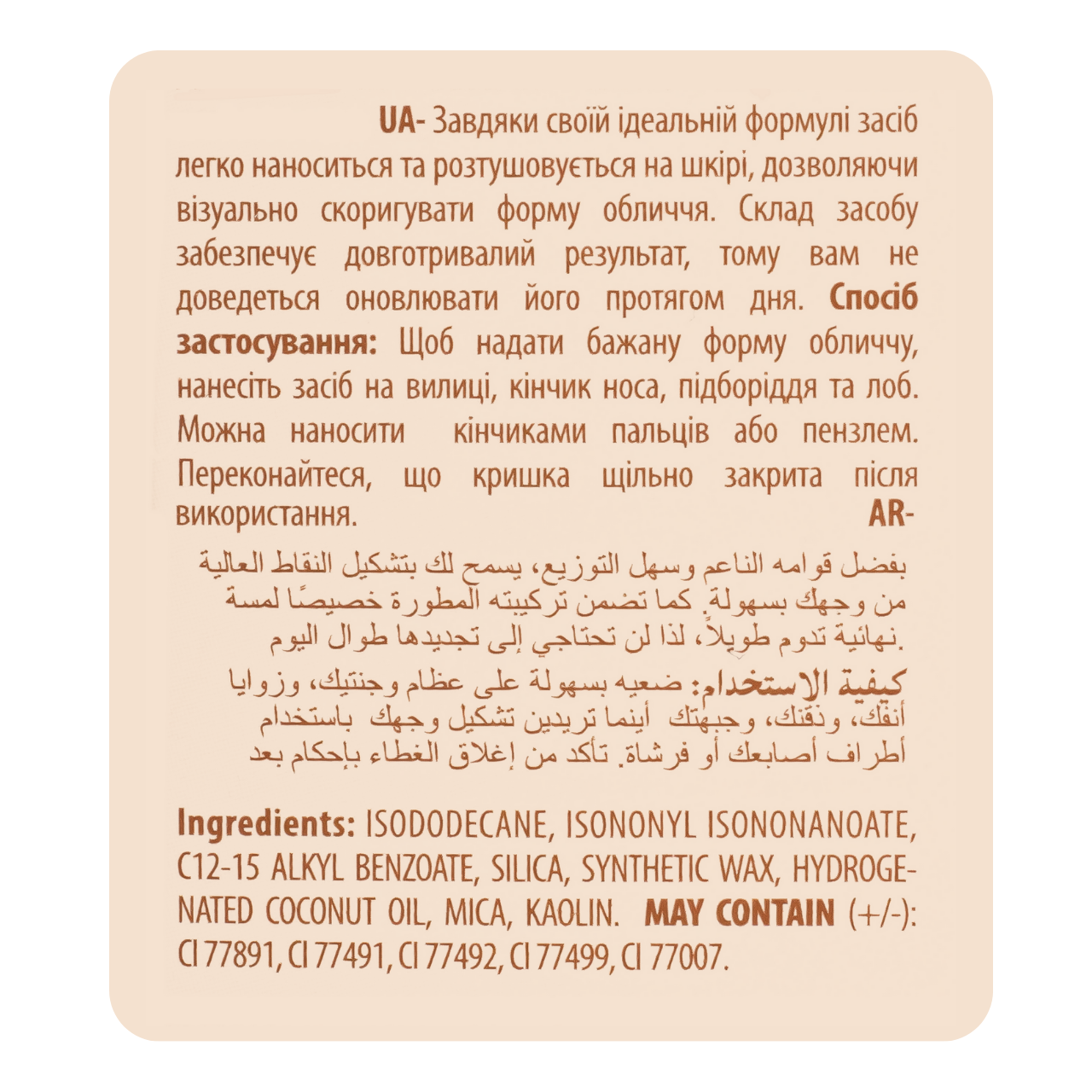 Стик-контур для макіяжу обличчя Neverti Shaping Stick для всіх типів шкіриБ'юті-продукт допоможе вам вигідно підкреслити риси обличчя, зробити його фактурнішим, скоригувати пропорції, приховати асиметрію та створити ідеальний макіяж професійного рівня.Контур у комфортній для застосування формі стика Neverti Shaping Stick має дуже зручну для розтушовування текстуру, лягає рівно, без плям. Цей стик для контурингу від Neverti допомагає створити природні тіні, не залишає жирного блиску. Стійка формула забезпечує тривалий результат, тому вам не доведеться оновлювати покриття впродовж дня.Контуринг-стик Neverti має в колекції кілька відтінків, щоб ви змогли підібрати ідеальний варіант для свого підтону. Скульптор підходить для всіх типів шкіри.Спосіб використання:Нанесіть коригувальний засіб у зонах, які необхідно затемнити, ретельно розтушуйте продукт спонжиком, пальцями або пензликом.Вага: 5 г