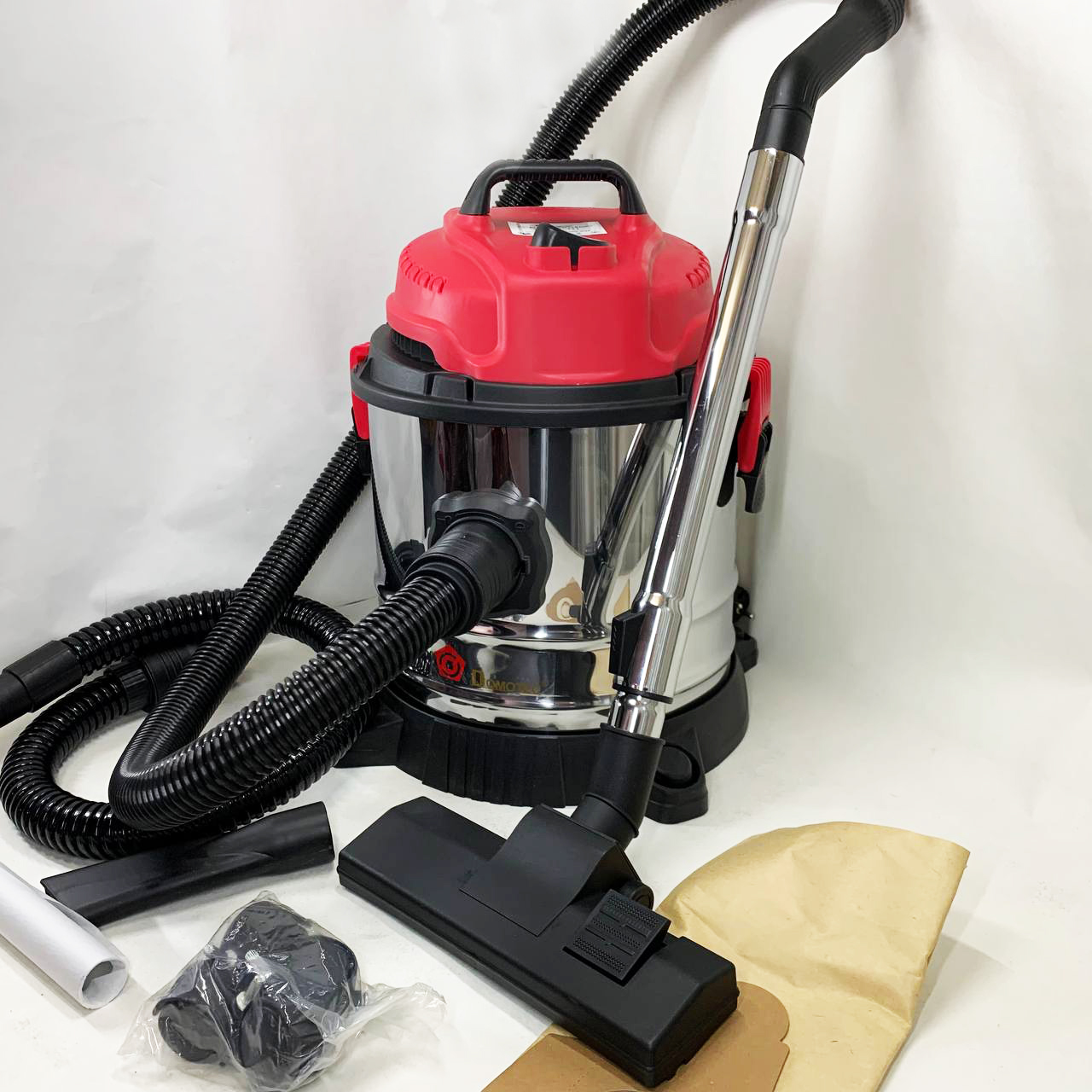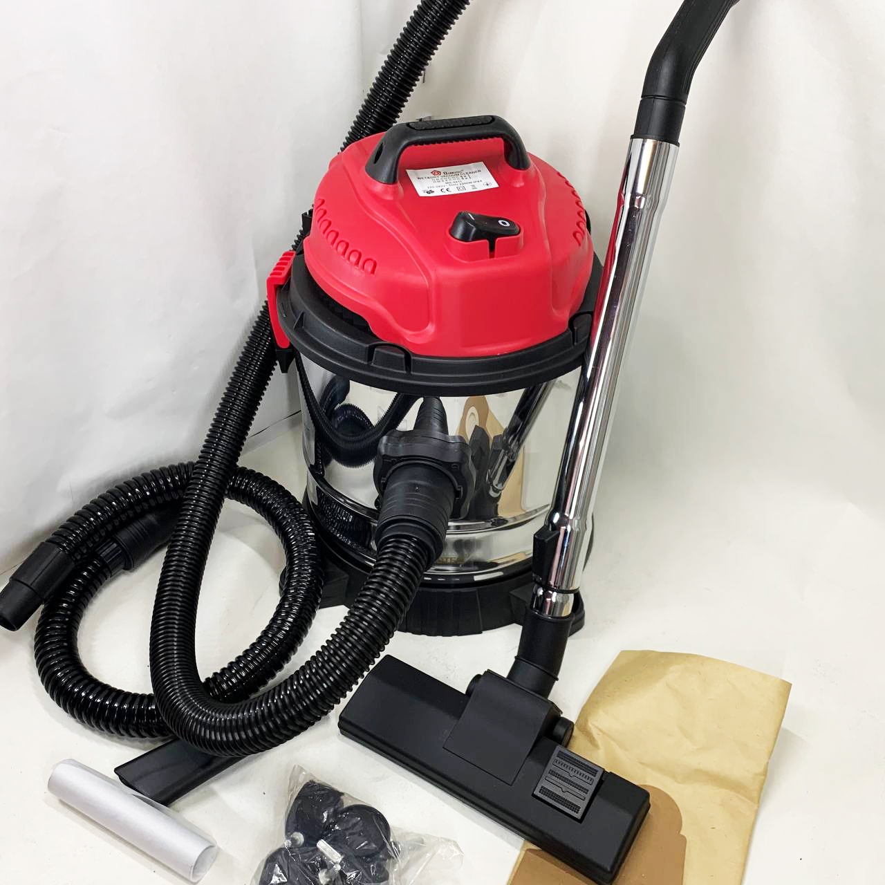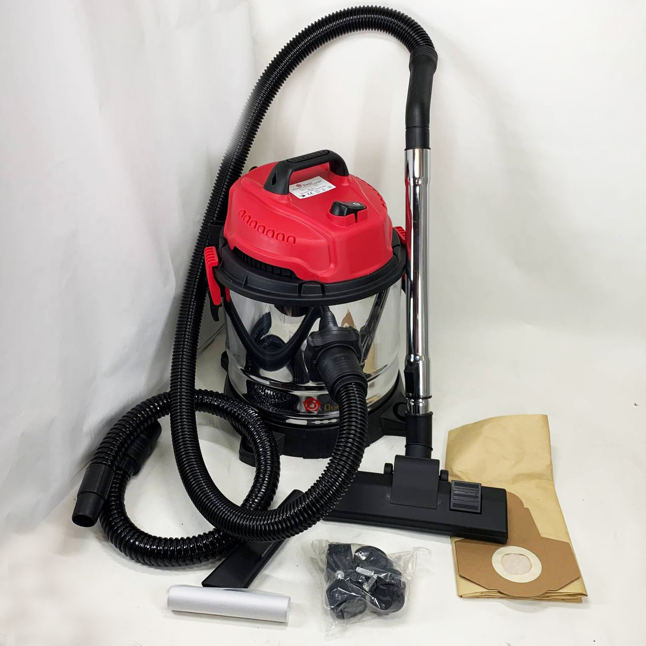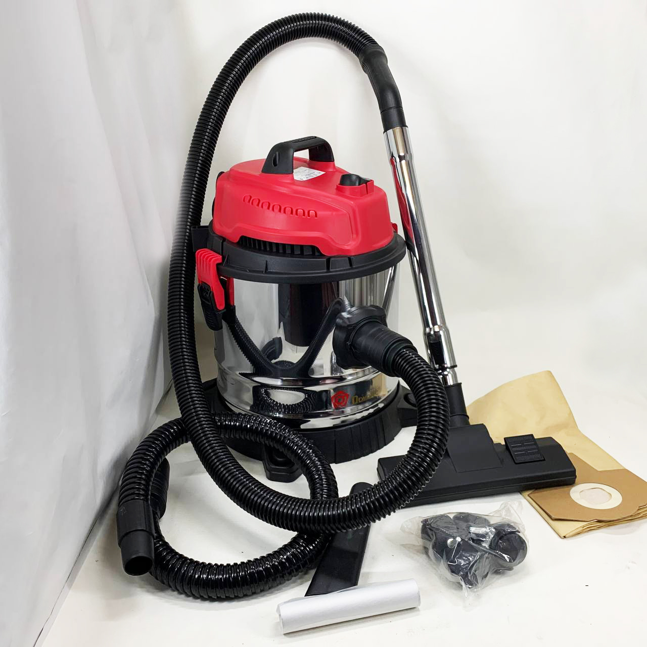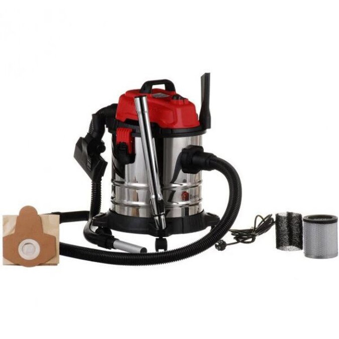 Пилосос оснащений баком з нержавіючої сталі та ударостійкою підставкою на колесах. Різні насадки допоможуть провести прибирання різних поверхонь.