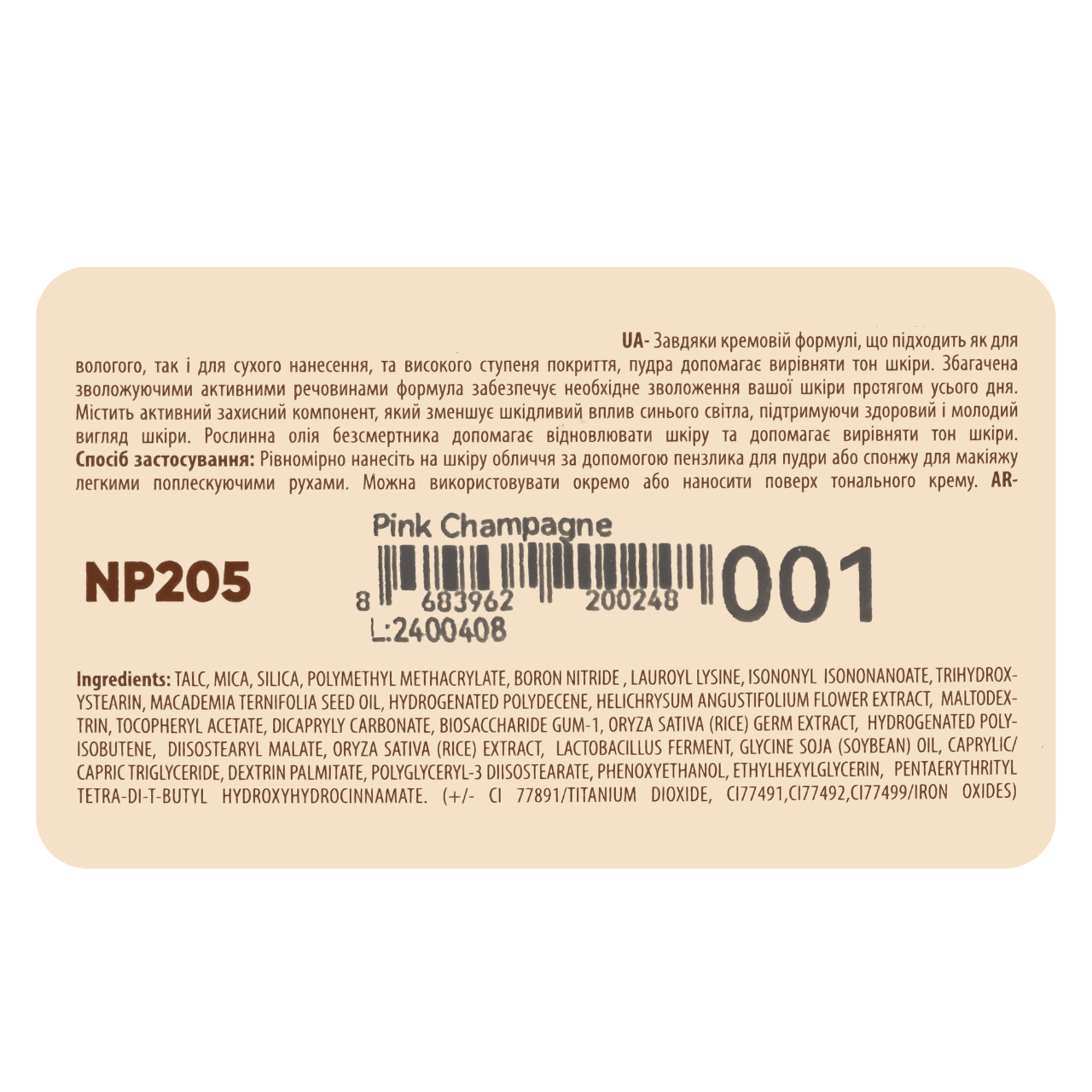| Колір маскуючого кошти | Золотистый|Розовый светлый |
