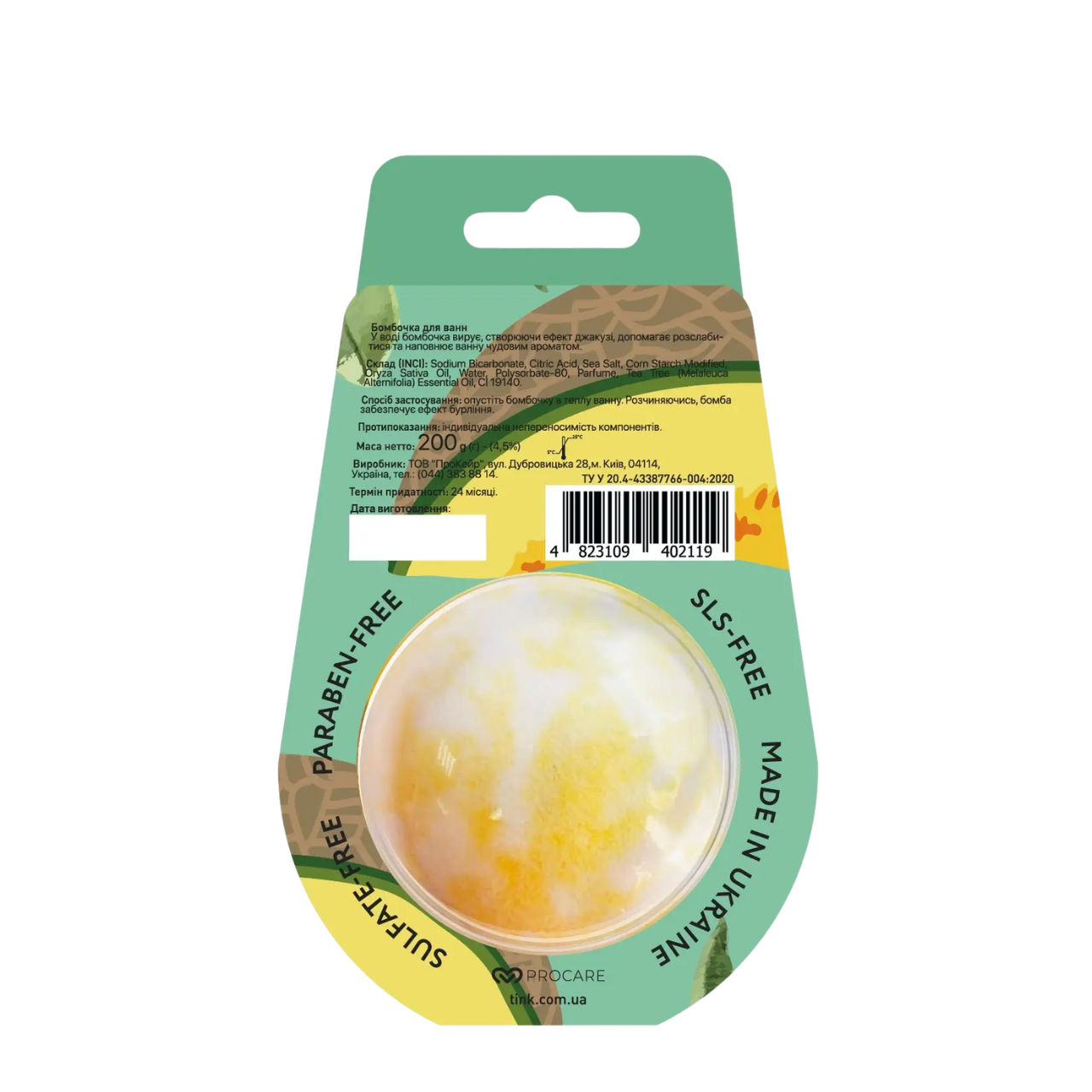 Бомбочка-гейзер для ванни Tink Melon з морською сіллю, олією рисових висівок, ефірною олією чайного дереваУ воді бомбочка вирує, створюючи ефект джакузі, допомагає розслабитися й наповнює ванну вишуканим і ніжним ароматом цукрової дині. Вода фарбується в сонячний жовтий колір, перетворюючи купання на справжню магію. Кулька для ванни має м'який безпечний склад, без парабенів, сульфатів.Активні компоненти бомбочки — морська сіль, олія рисових висівок і ефірна олія чайного дерева — сприяють зволоженню та живленню дерми. Шкіра стає ще м'якшою й оксамитовою.Переваги кульки-гейзера для прийняття ванни Tink Melon:Інтенсивний релакс: приймання ванни з цією бомбочкою перетвориться на справжній ритуал розслаблення, завдяки ефекту джакузі, створюваному бурхливим розчиненням у воді.