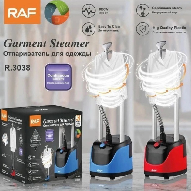 Відпарювач для одягу RAF R.3038 – це потужний, простий і зручний в експлуатації прилад, який легко впорається з прасуванням одягу з будь-яких видів тканини, розгладжуванням штор і постільної білизни, допоможе видалити неприємний запах з речей, провести. Особливо корисним відпарювач буде для сімей, де є діти, адже за його допомогою можна легко продезінфікувати іграшки.