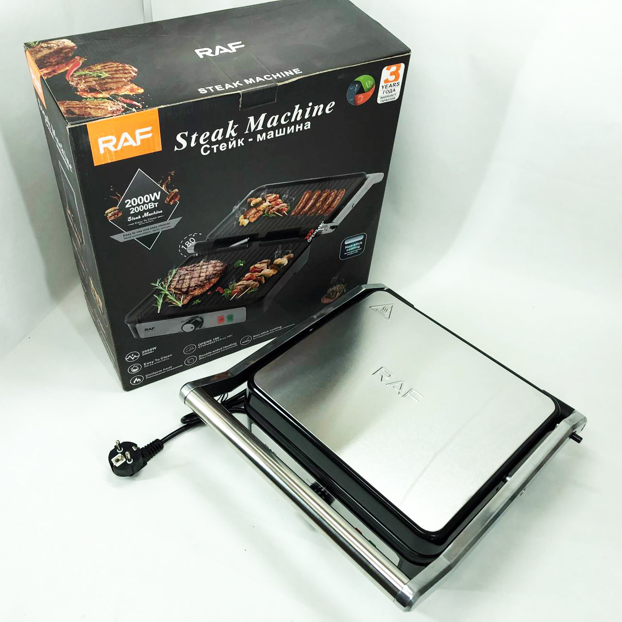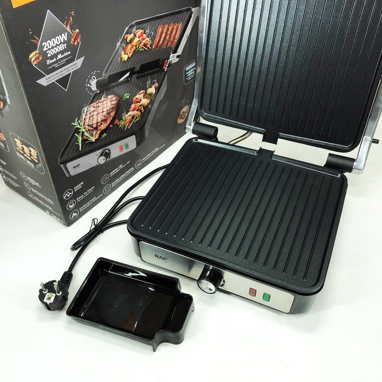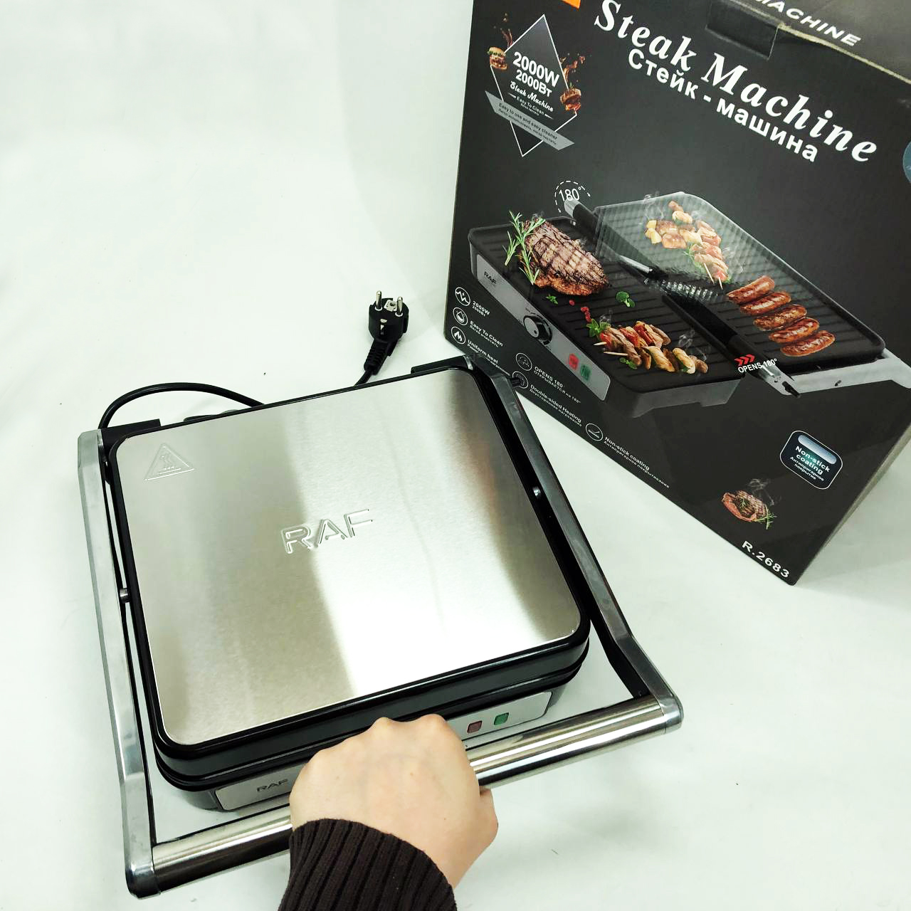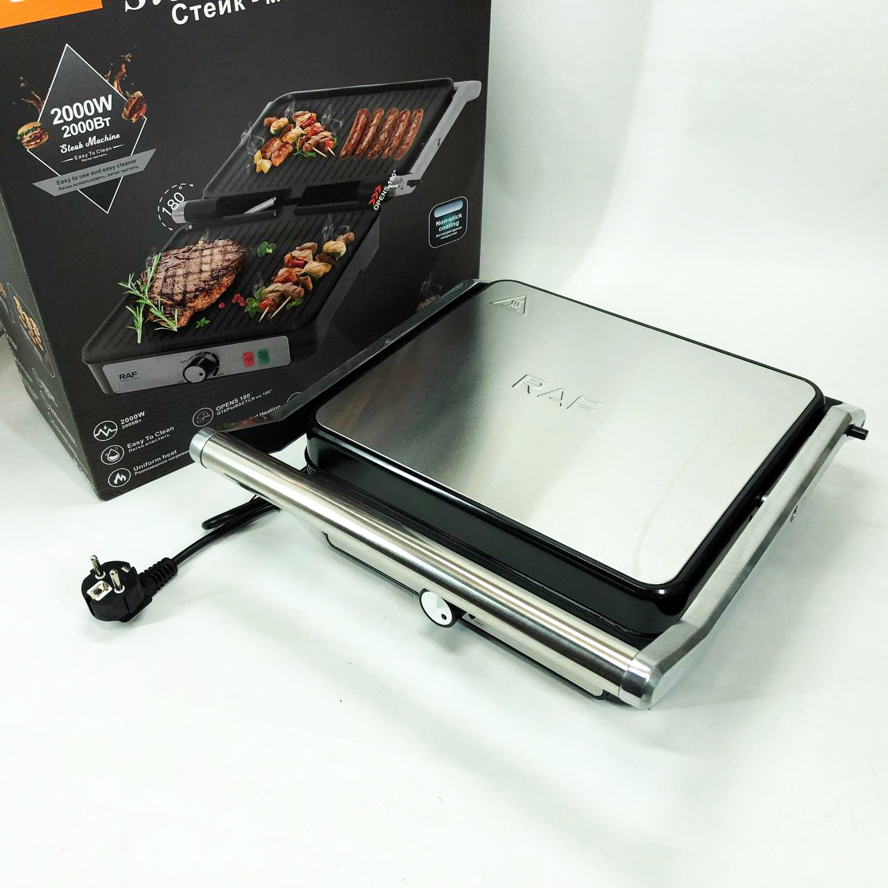 Контактний гриль притискний електричний з терморегулятором та антипригарним покриттям RAF R-2683 – Хочете в будь-який час насолодитися соковитим стейком, хрусткими овочами чи паніні? Вам більше не потрібно мати кухню, повну побутової техніки. Все, що вам потрібно, – це електричний гриль RAF. Гриль має функцію барбекю. Ви можете готувати на грилі одночасно на двох відкритих пластинах. З одного боку овочі, з іншого – соковита свинина.