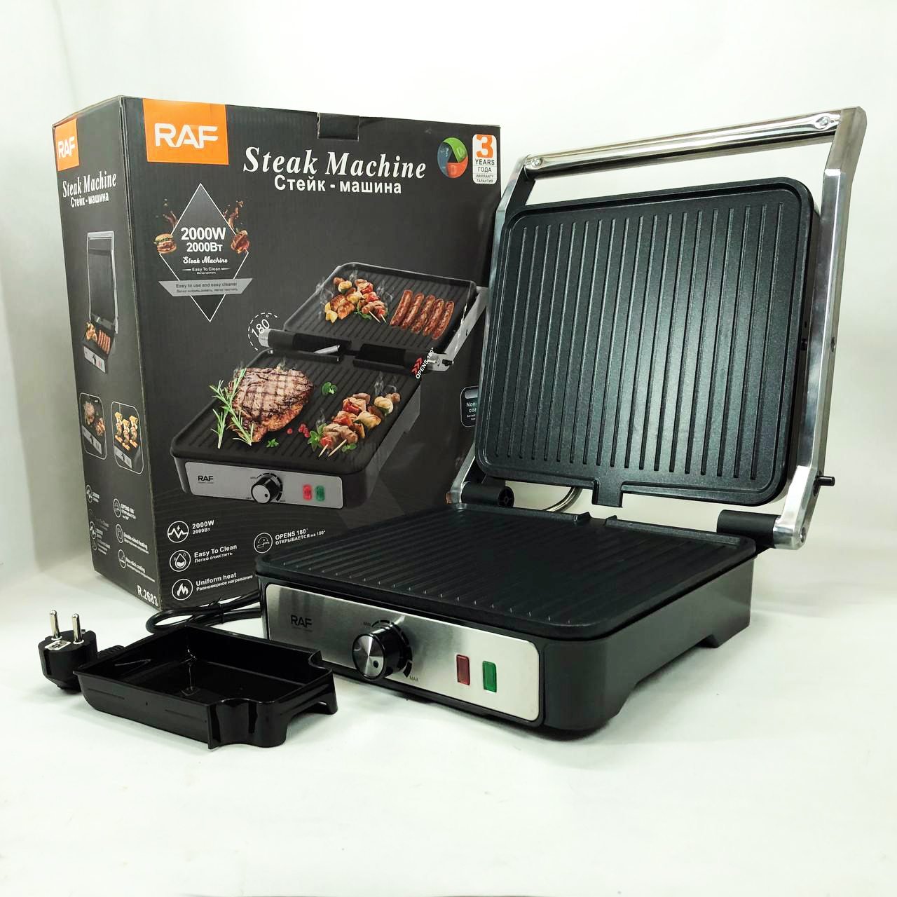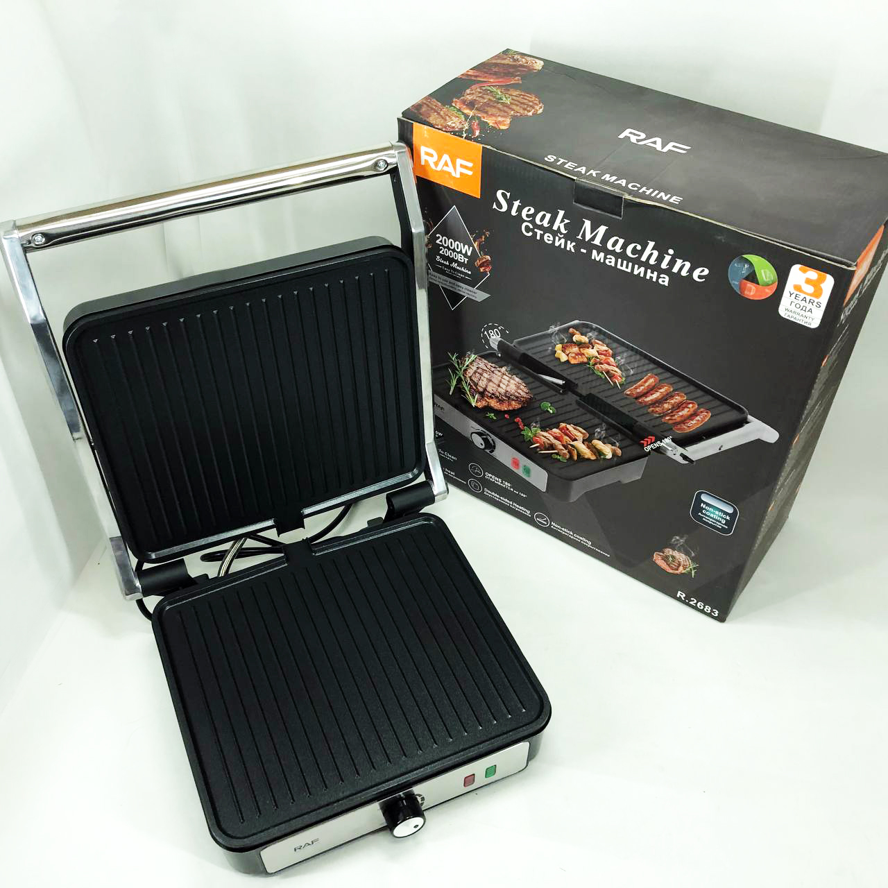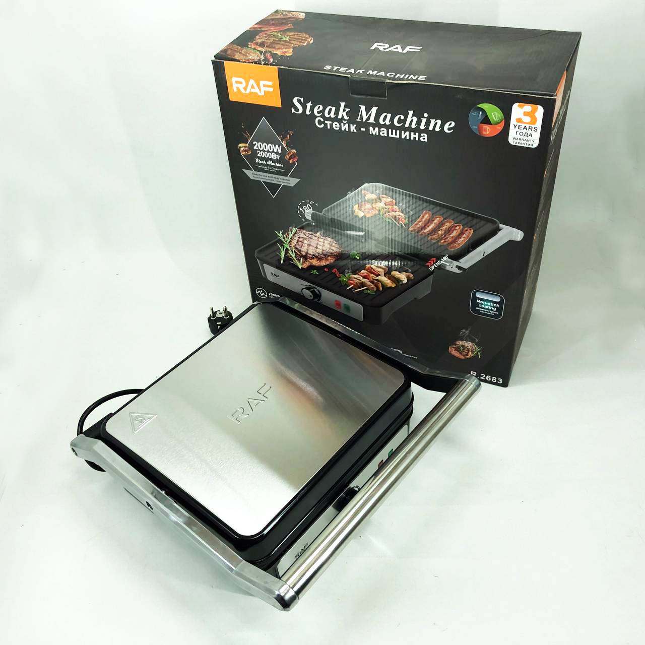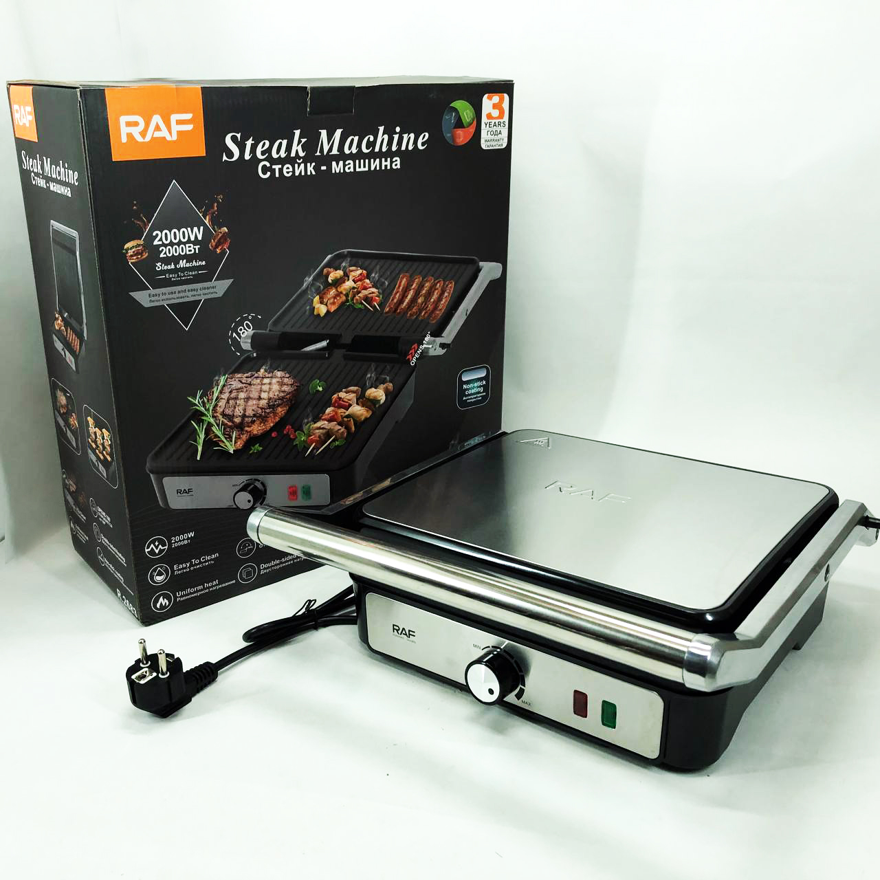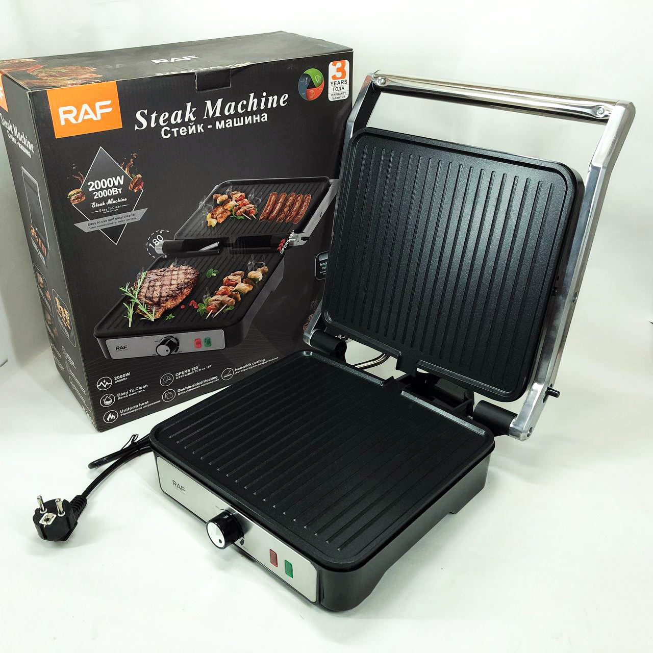 Контактний гриль притискний електричний з терморегулятором та антипригарним покриттям RAF R-2683 – Хочете в будь-який час насолодитися соковитим стейком, хрусткими овочами чи паніні? Вам більше не потрібно мати кухню, повну побутової техніки. Все, що вам потрібно, – це електричний гриль RAF. Гриль має функцію барбекю. Ви можете готувати на грилі одночасно на двох відкритих пластинах. З одного боку овочі, з іншого – соковита свинина.