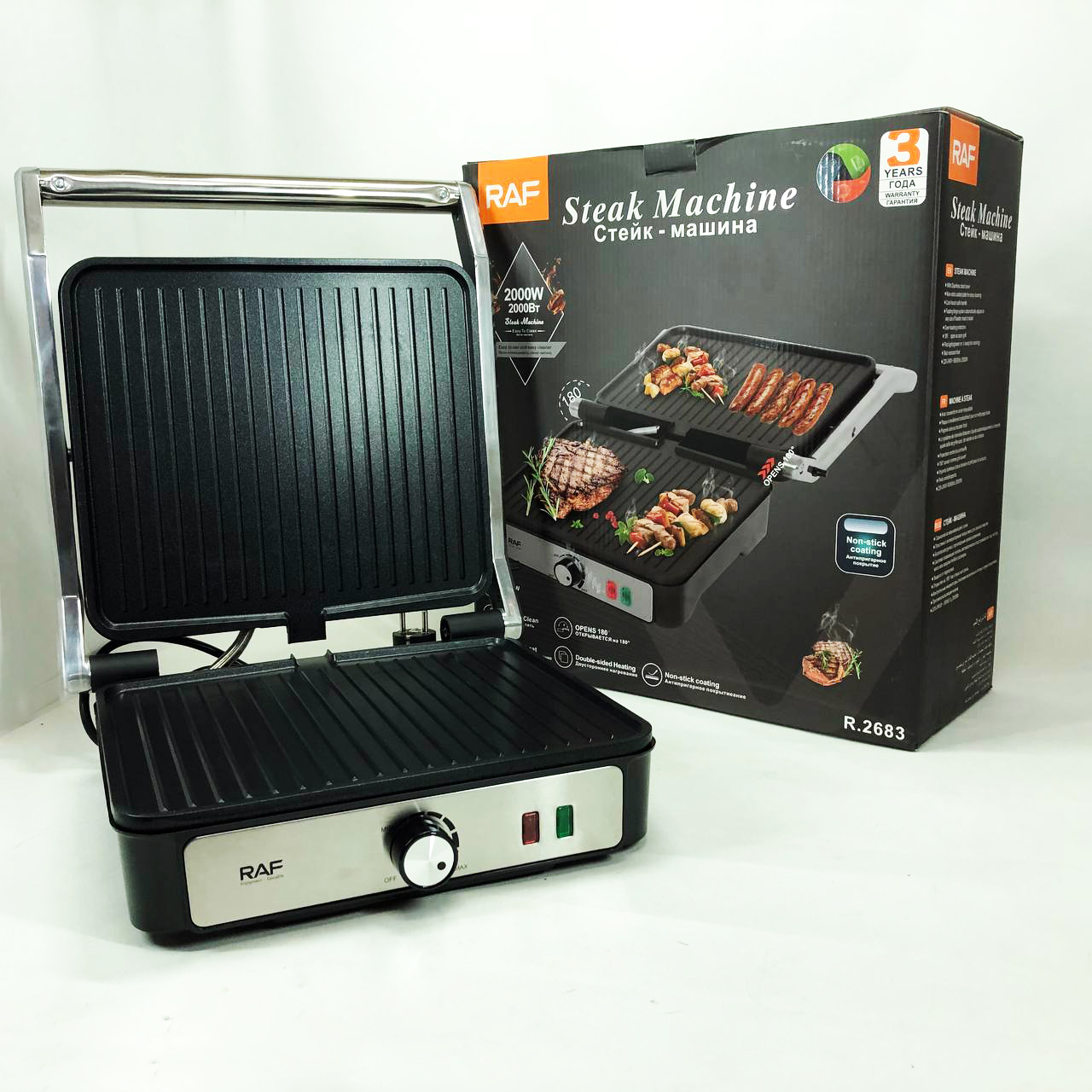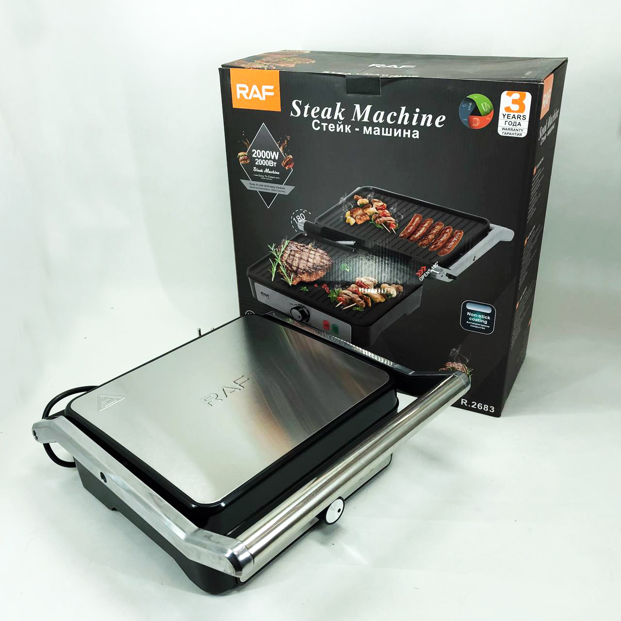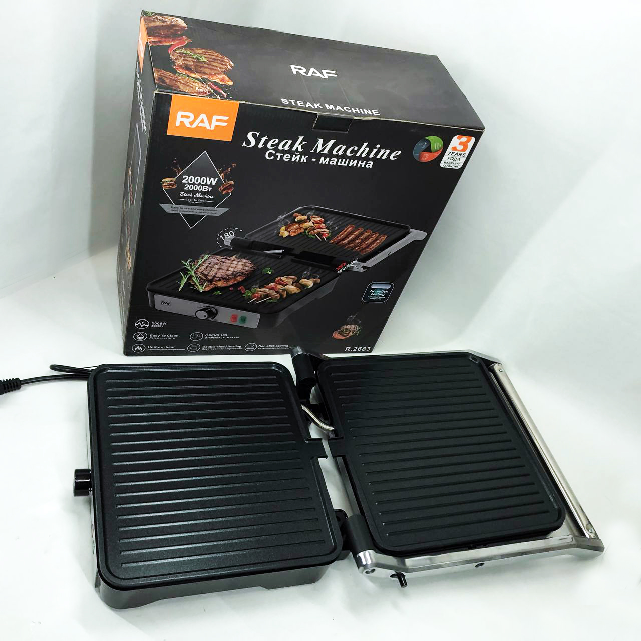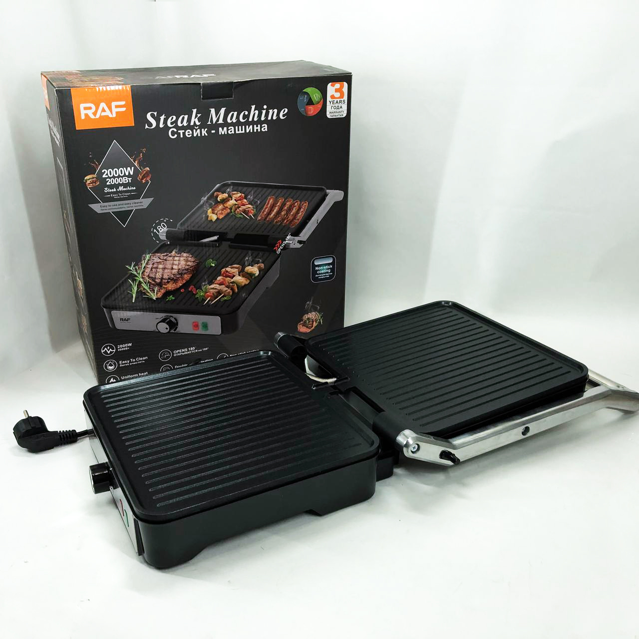 Контактний гриль притискний електричний з терморегулятором та антипригарним покриттям RAF R-2683 – Хочете в будь-який час насолодитися соковитим стейком, хрусткими овочами чи паніні? Вам більше не потрібно мати кухню, повну побутової техніки. Все, що вам потрібно, – це електричний гриль RAF. Гриль має функцію барбекю. Ви можете готувати на грилі одночасно на двох відкритих пластинах. З одного боку овочі, з іншого – соковита свинина.