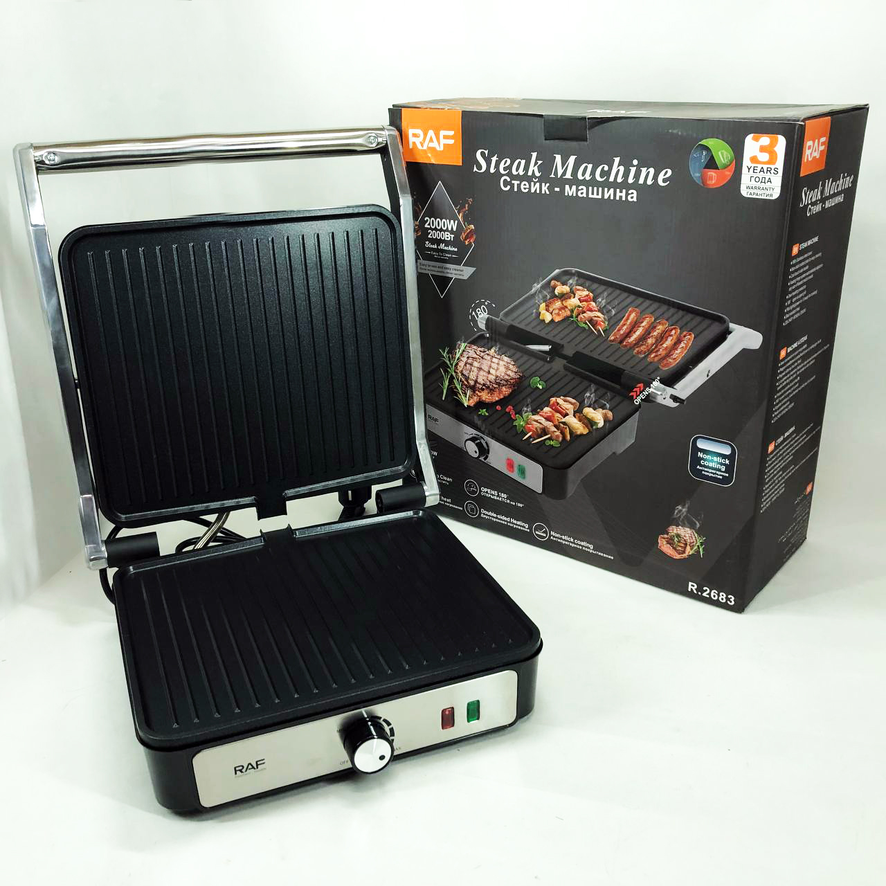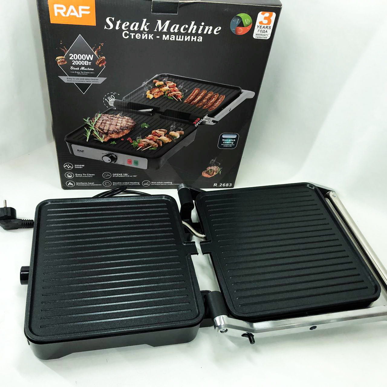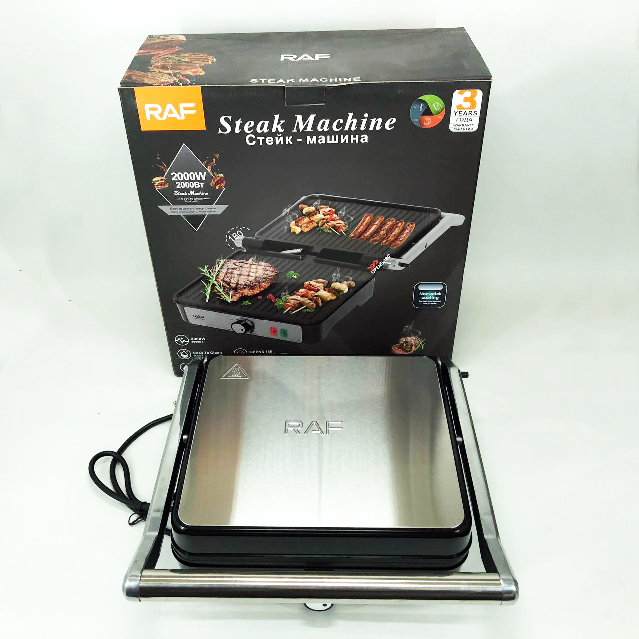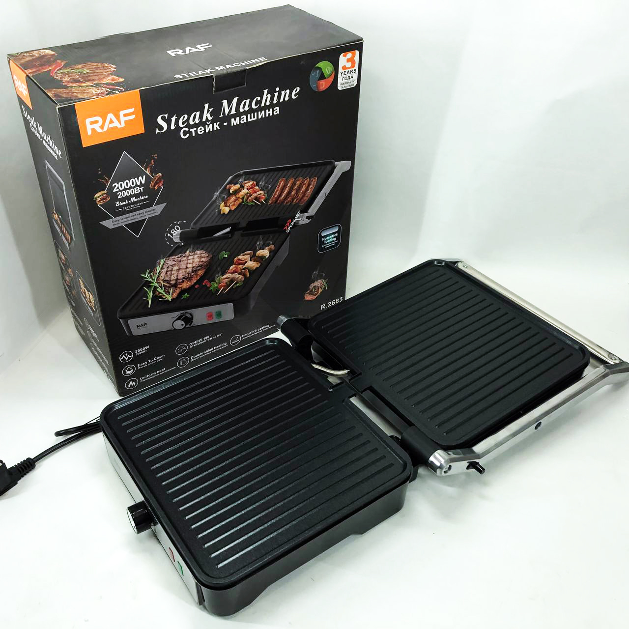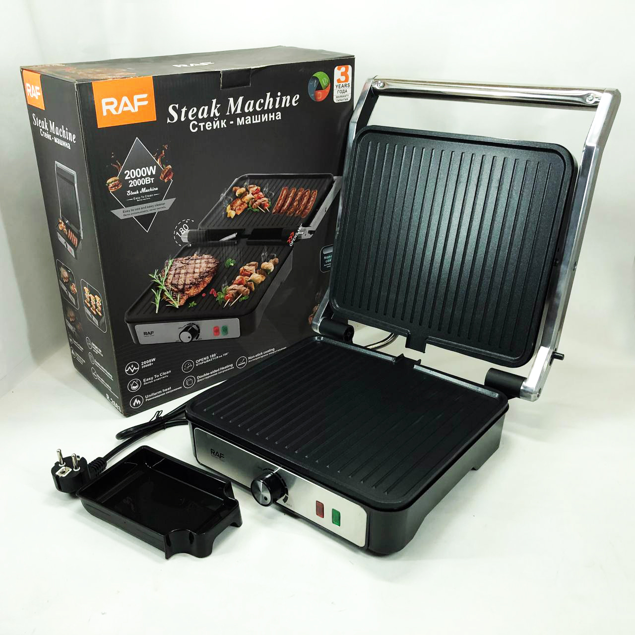 Контактний гриль притискний електричний з терморегулятором та антипригарним покриттям RAF R-2683 – Хочете в будь-який час насолодитися соковитим стейком, хрусткими овочами чи паніні? Вам більше не потрібно мати кухню, повну побутової техніки. Все, що вам потрібно, – це електричний гриль RAF. Гриль має функцію барбекю. Ви можете готувати на грилі одночасно на двох відкритих пластинах. З одного боку овочі, з іншого – соковита свинина.
