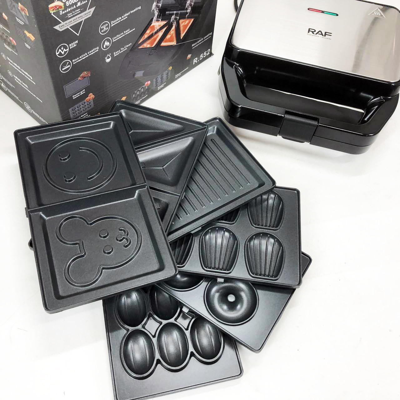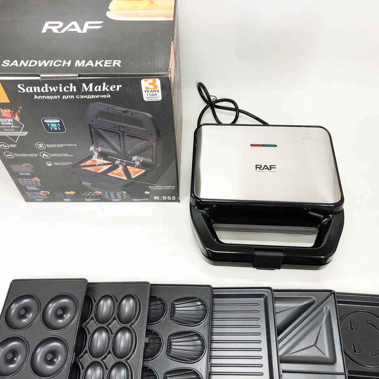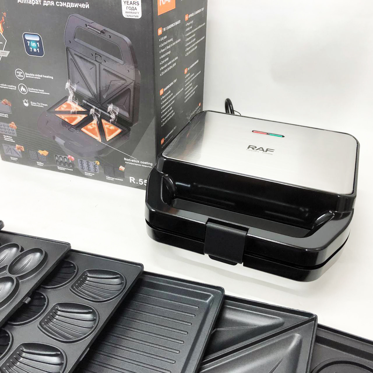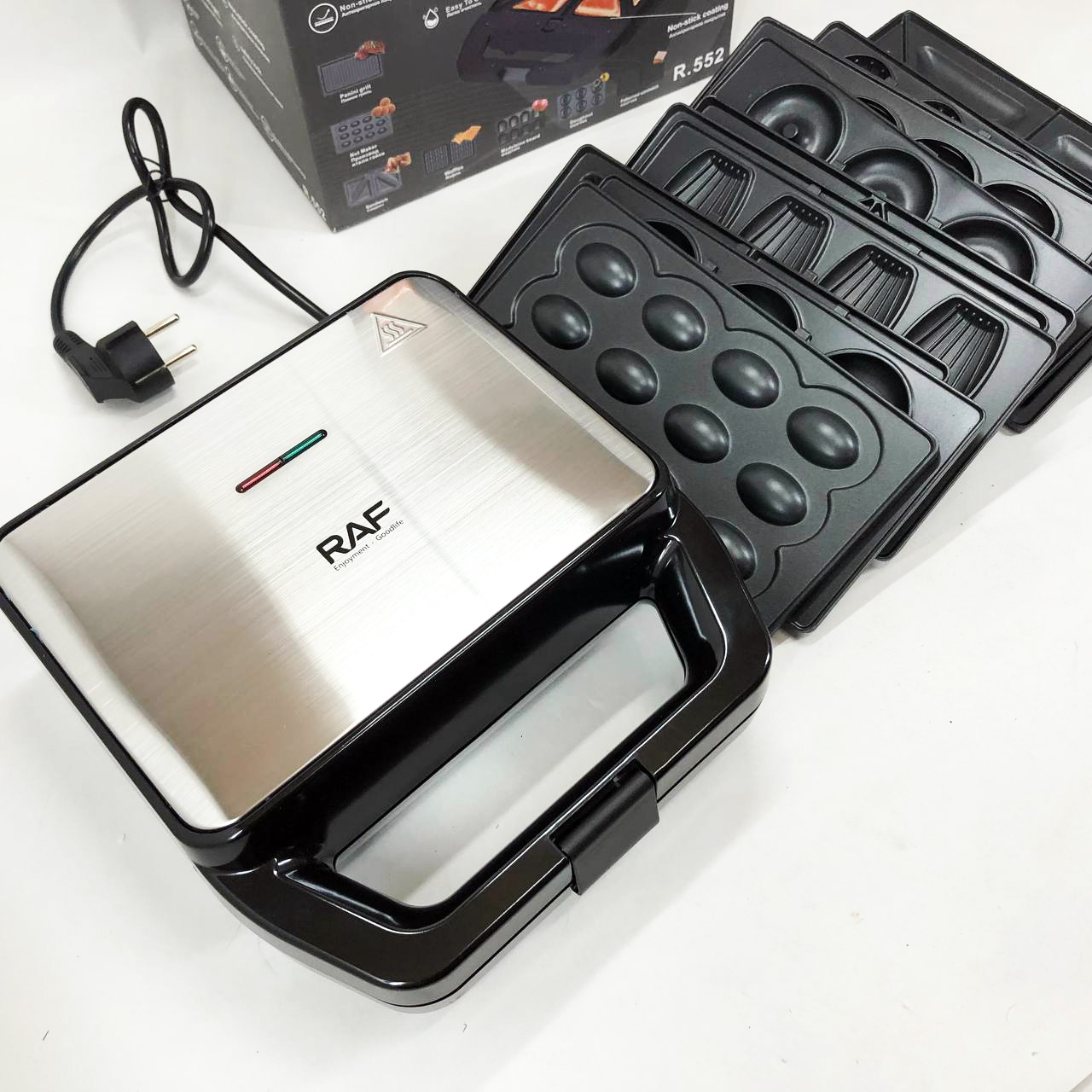 RAF R.552 – це  універсальний кухонний прилад, який поєднує в собі 7 різних функцій, дозволяючи готувати різноманітні страви. Завдяки  змінним антипригарним пластинам, він може працювати як мультигріль, вафельниця, сендвічниця, прилад для приготування пончиків, кексів, горішків та печива.