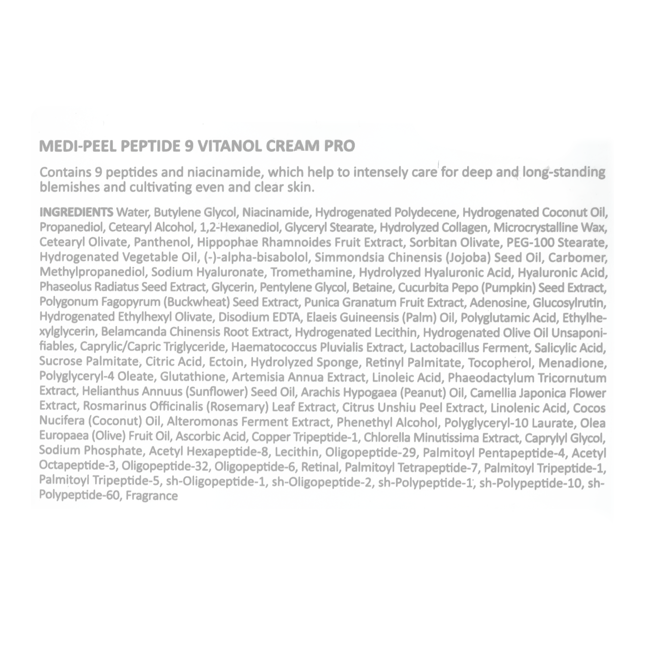 Омолоджувальний пептидний крем для обличчя Medi-Peel Peptide 9 Vitanol Cream Pro з вітаноломMedi-Peel Peptide 9 Vitanol Cream Pro — передове рішення в галузі косметології, яке допоможе вам отримати сяйну, еластичну, гладку шкіру без пігментних плям.Цей інноваційний б'юті-продукт від відомого корейського бренду Medi-Peel поєднує в собі високу концентрацію ніацинаміду (12%) й унікальний комплекс вітанолу, що містить вітаміни A, E, F, K, для цілеспрямованої боротьби з темними плямами та ефективного вибілювання шкіри.9 типів пептидів разом із ніацинамідом створюють феноменальний синергетичний ефект. Потужна дія цього дуету повертає сяйво, покращує тон і загальний стан, роблячи шкіру пружнішою й еластичнішою.Які проблеми розв'язує:глибокі пігментні плями;