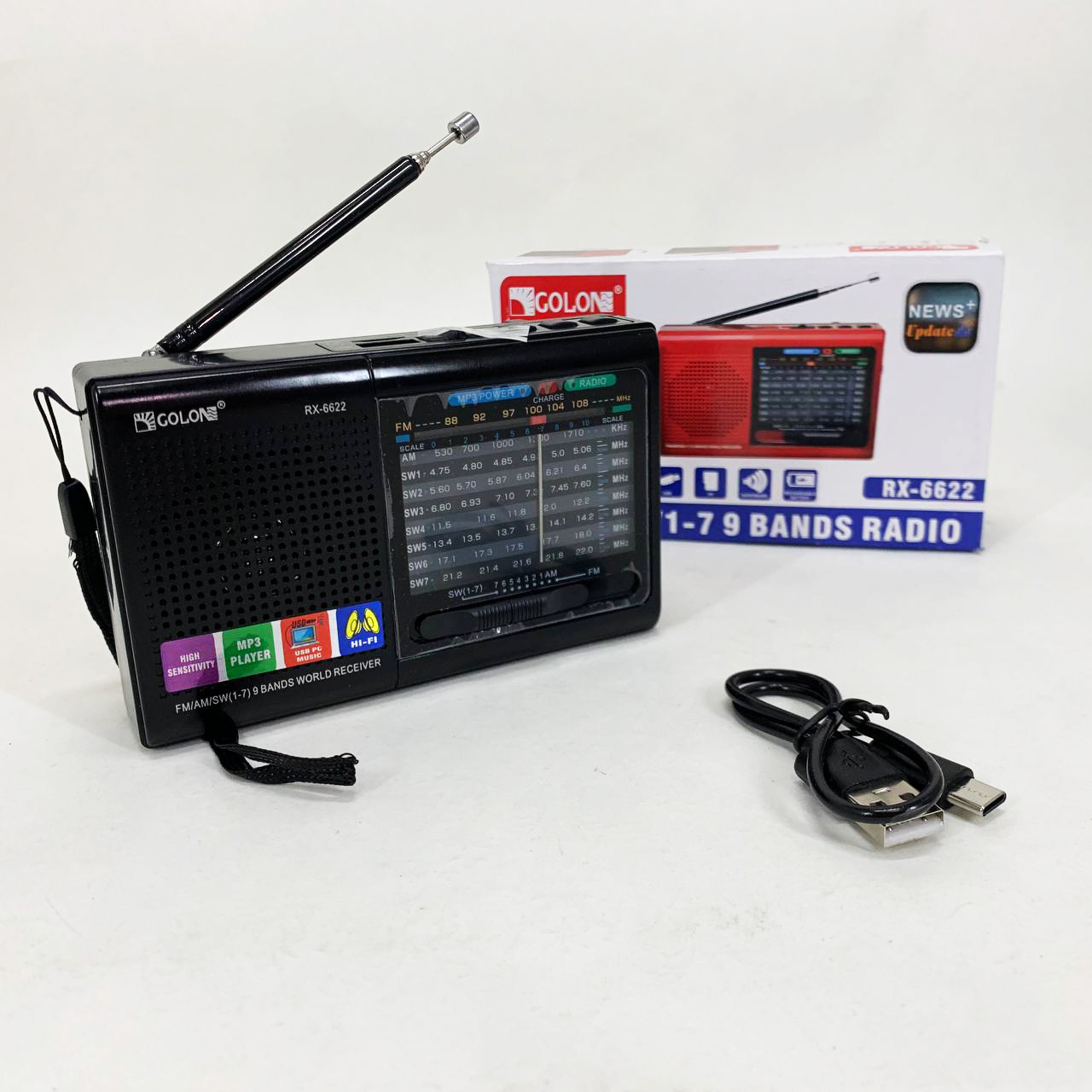 - Частотний діапазон: FM 88-108 MHz, SW (1-7) 4.75-22 MHz, AM 530-1710 KHz;