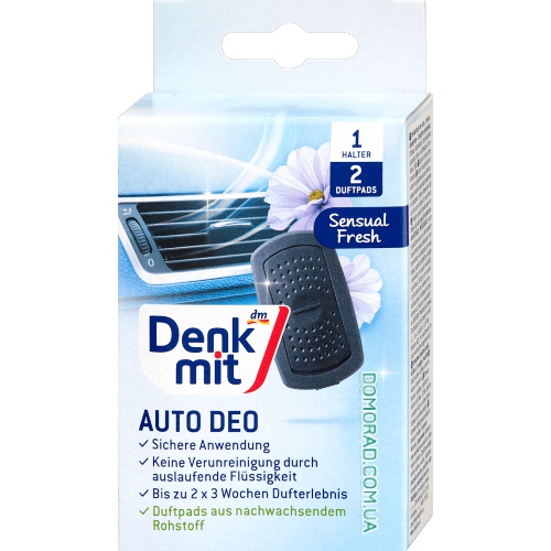 Автомобільний дезодорант Denkmit Sky & Air пахне приємно свіжим та видаляє неприємні запахи завдяки запатентованій технології Neofresh®. Залежно від температури та інтенсивності циркуляції повітря, автодезодорант розгортає свою дію протягом декількох тижнів.
