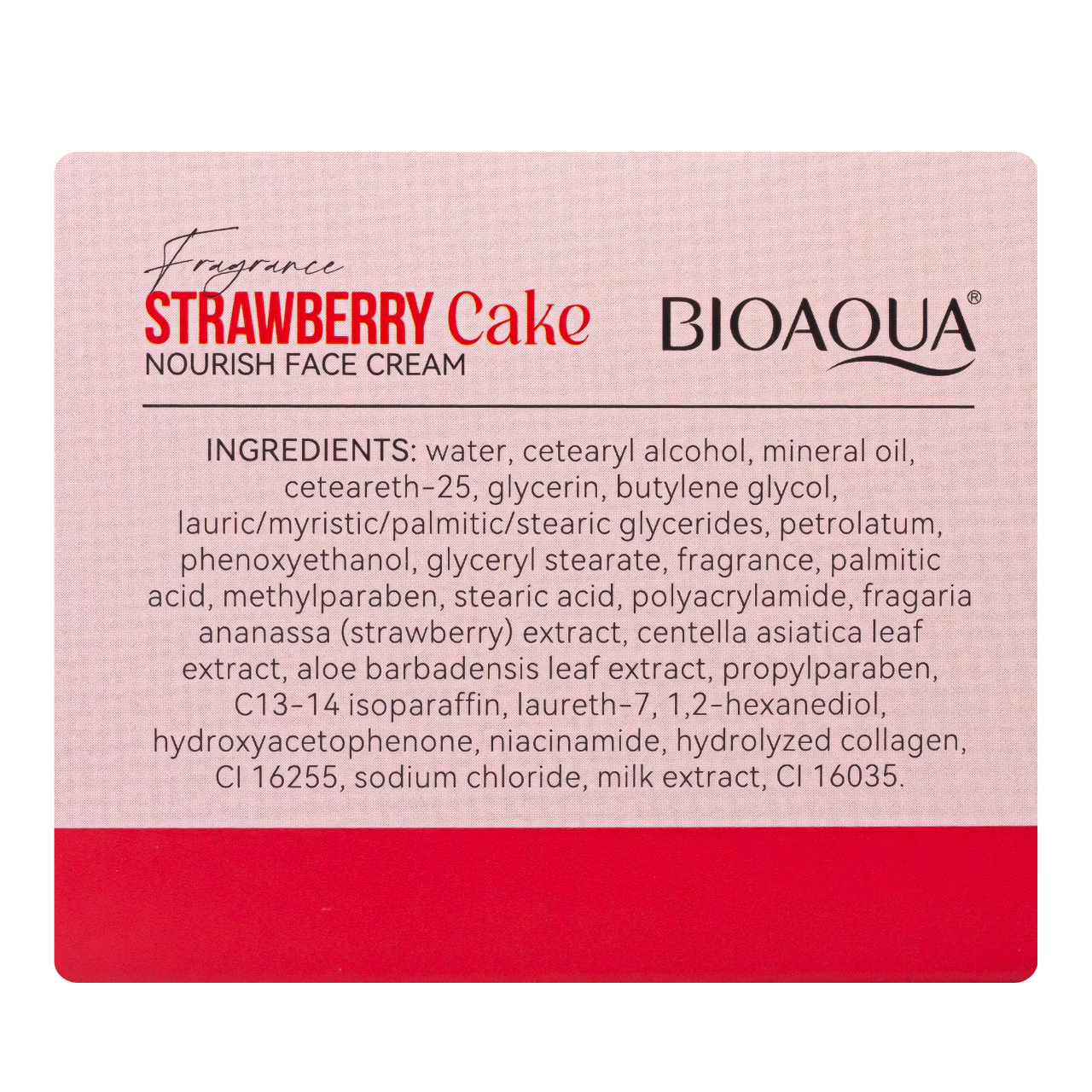 Живильний крем для обличчя Bioaqua Strawberry Cake з екстрактом полуниці, алое, центелиКрем Bioaqua Strawberry Cake — це живильний догляд для сяйливої та гладкої шкіри обличчя. Формула з екстрактом полуниці, центели азійської та ніацинамідом ефективно бореться з тьмяністю, лущенням, зморшками та пігментацією.Крем має густу текстуру, швидко вбирається й залишає легкий аромат стиглої полуниці. Ідеально підходить для щоденного догляду!Як працюють активні компоненти крему для обличчя від Bioaqua:екстракт полуниці — вирівнює тон шкіри, надає свіжості та м'якості.;