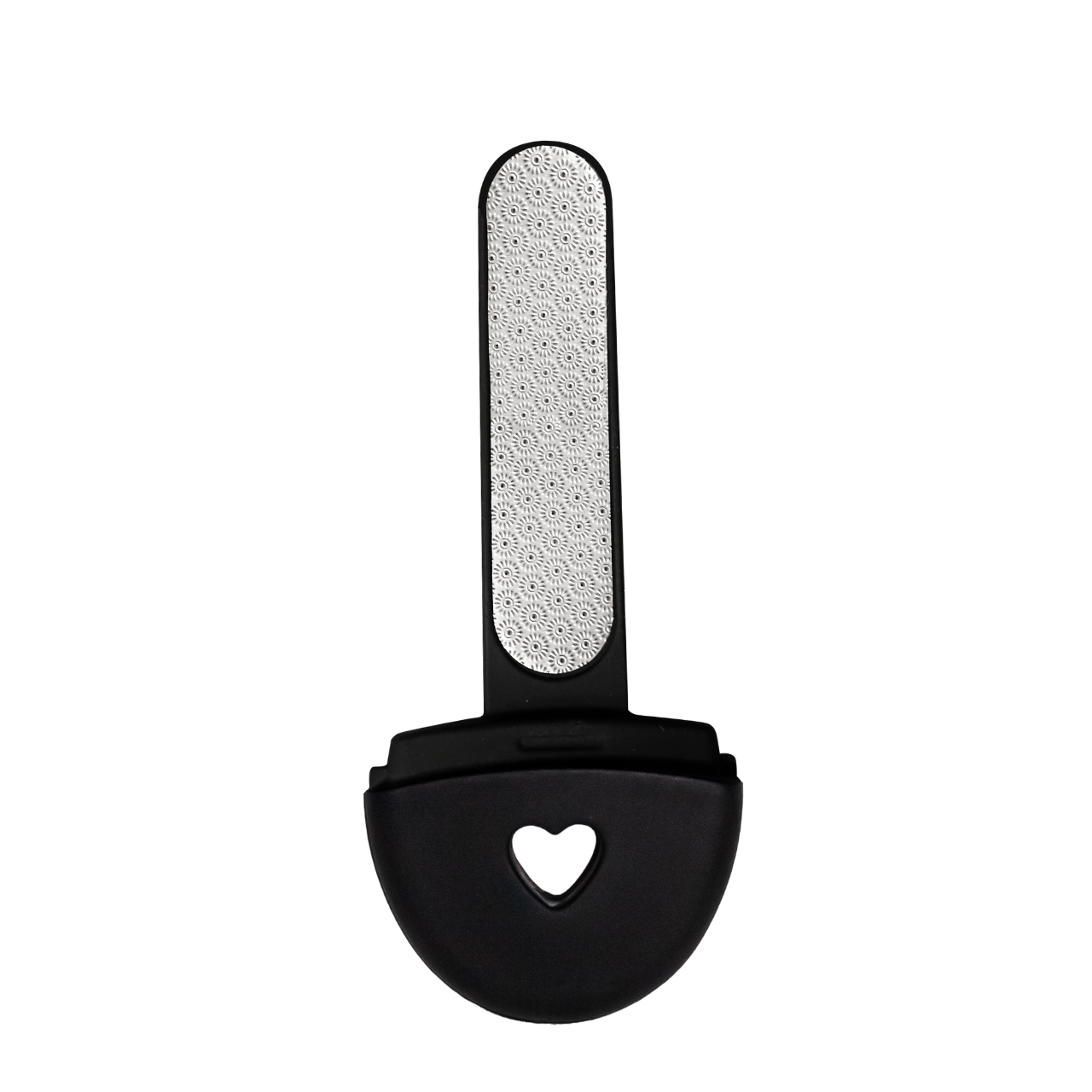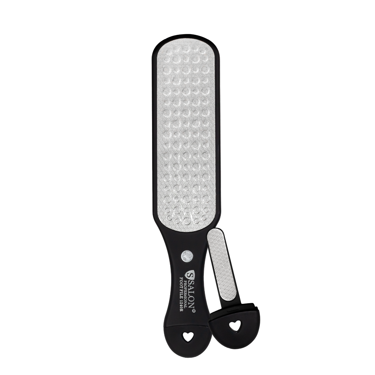 вбудована в ручку маленька металева тертка для п'ят для важкодоступних зон.Лазерна пилка для п'ят від бренду Salon Professional виконана з міцного металу, який не боїться вологи. Підходить для дезінфекції та багаторазового використання. Металева терка для ніг не ушкоджує шкіру та не викликає дискомфорту при правильному застосуванні. Шліфування підходить як для професійного педикюру, так і для домашнього догляду за шкірою стоп.Як використовувати:Перед першим застосуванням зніміть зі шліфувальної пилки для педикюру захисну плівку.