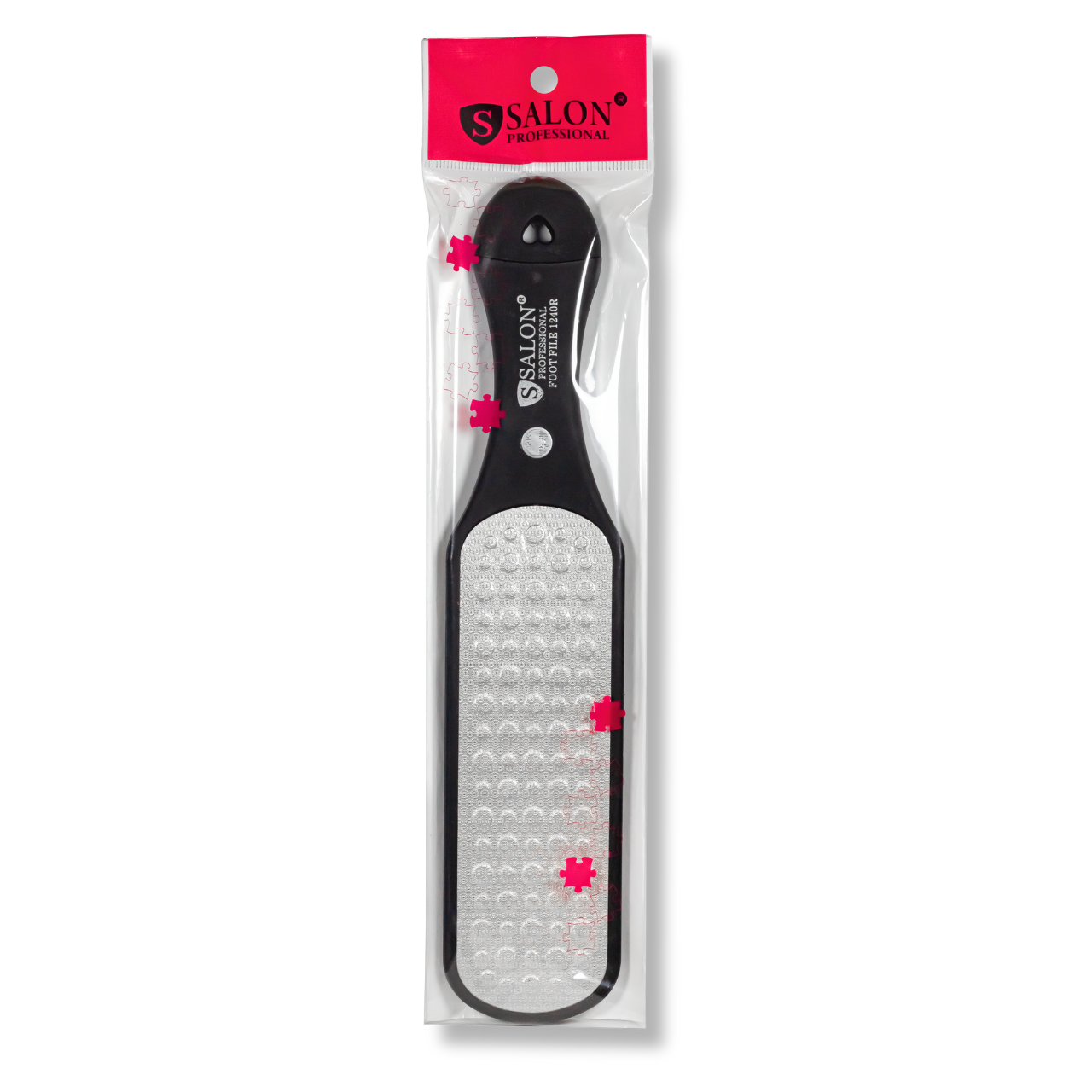 Лазерна терка для ніг Salon Professional 1240R зі шліфувальною поверхнеюЛазерна терка для ніг Salon Professional 1240 R – це професійна терка для педикюру, яка допомагає ефективно та безпечно доглядати шкіру стоп. Аксесуар для педикюру дозволяє ефективно і швидко видалити загрубілу шкіру, натоптні та мозолі, забезпечуючи гладкість і доглянутий вигляд ніг навіть у домашніх умовах.Переваги металевої терки для ніг Salon Professional:двостороння лазерна обробка з різним ступенем абразивності;