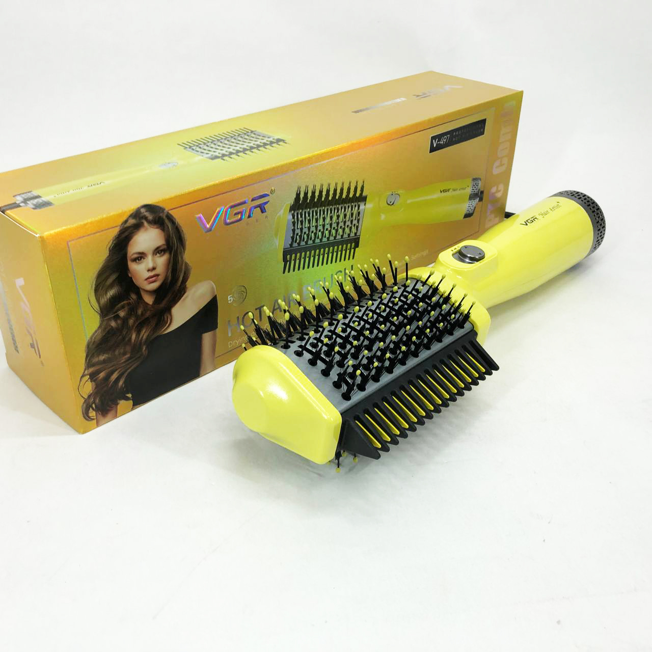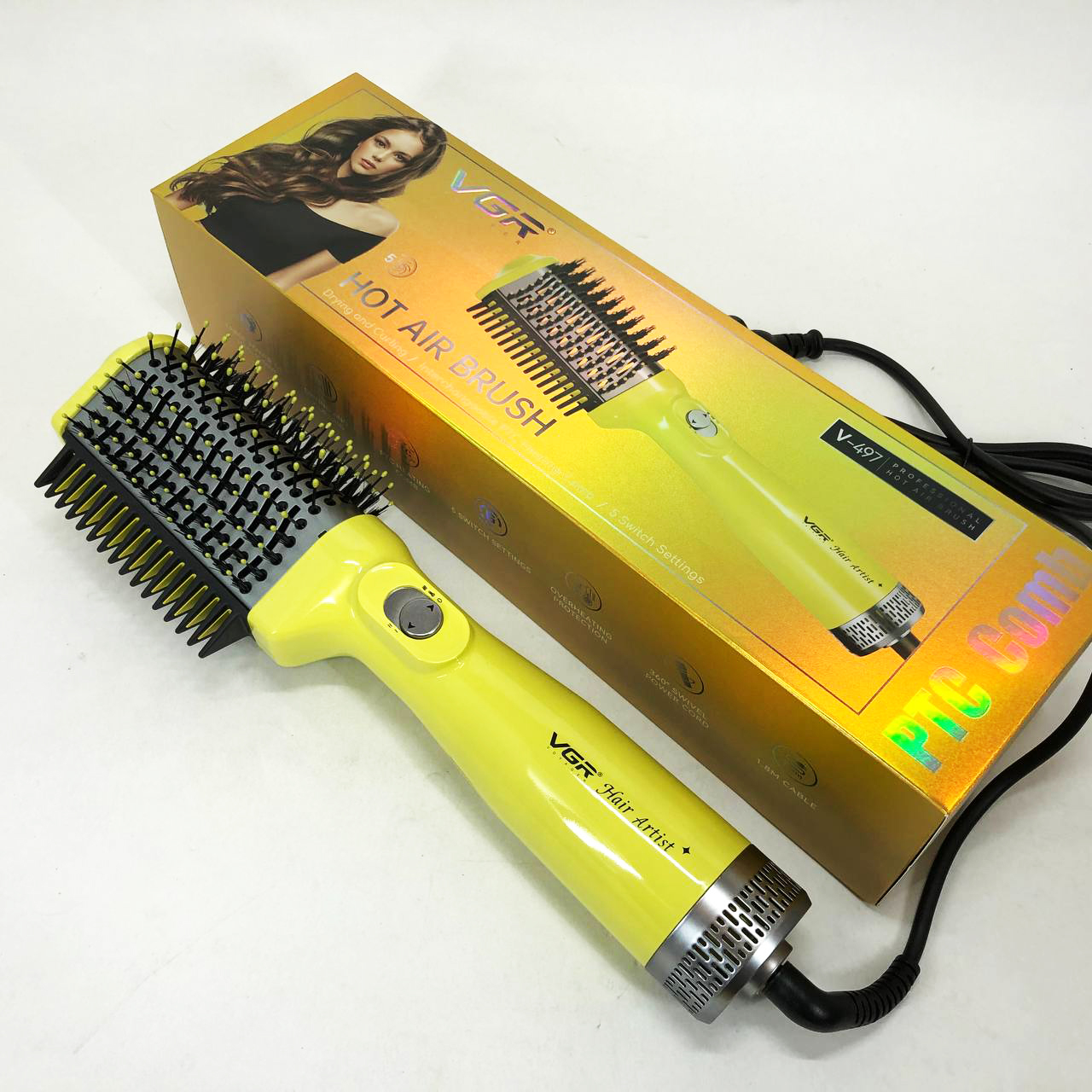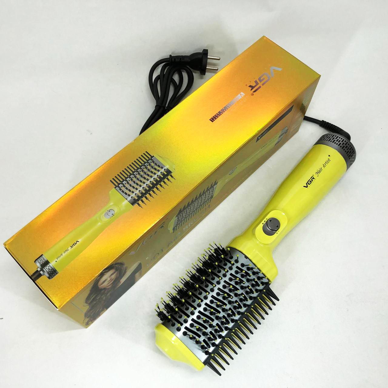 Фен-щітка для волосся VGR V-497– пристрій, який може замінити одночасно плойку, праску та фен. Він може використовуватися для сушіння волосся та моделювання зачісок, вирівнювання пасм та створення ефектних укладок. Мультистайлер має поворотну насадку з керамічним покриттям, завдяки чому виключено перегрів та пошкодження локонів.